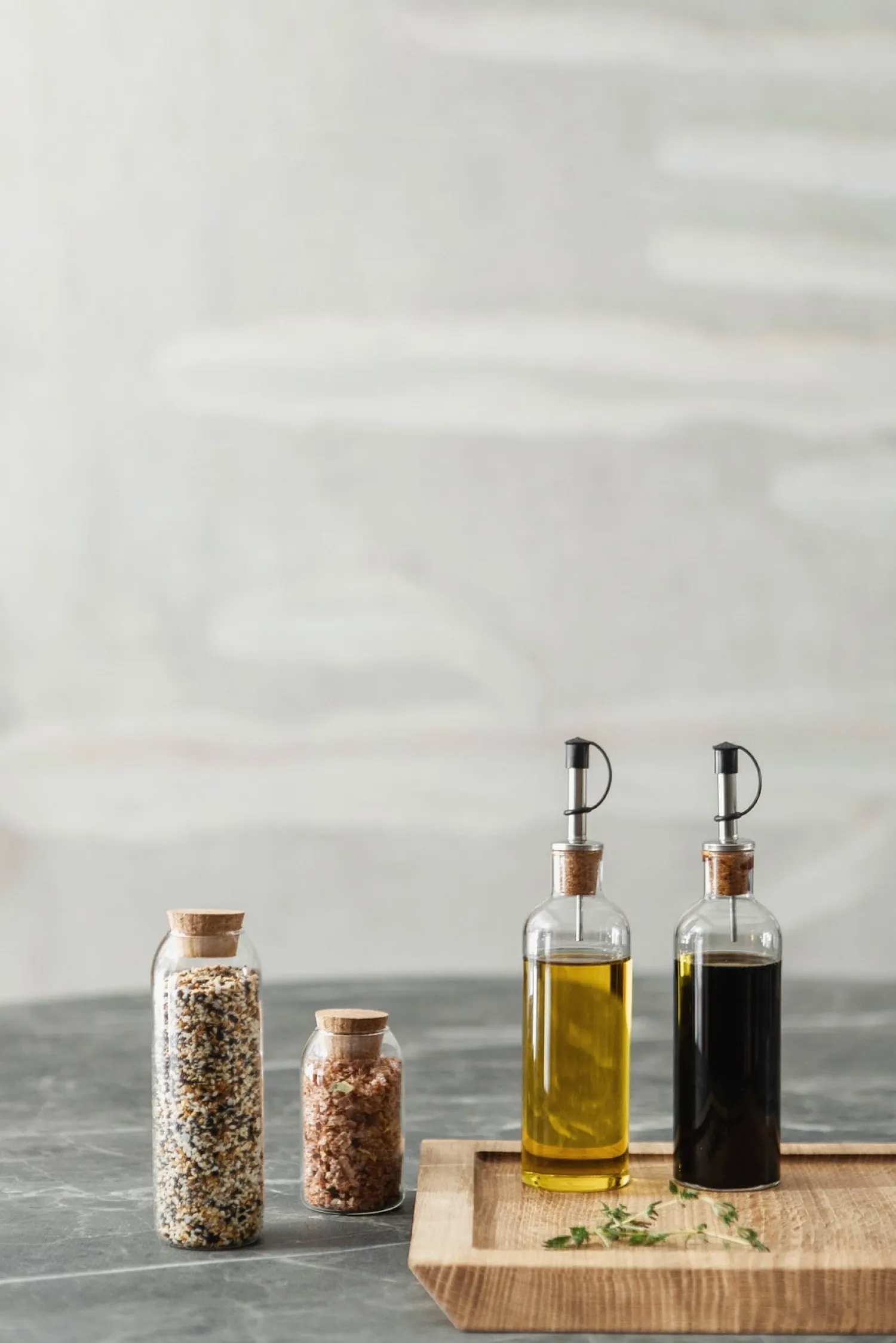 Flaskerne er lavet af glas, som er nemt at rengøre og forbliver klare over tid. Korkpropperne sikrer en tæt lukning, mens metaldetaljerne giver stabilitet. Kombinationen af disse materialer gør flaskerne velegnede til daglig brug i køkkenet, hvor de kan stå fremme på bordet eller opbevares i skabet.