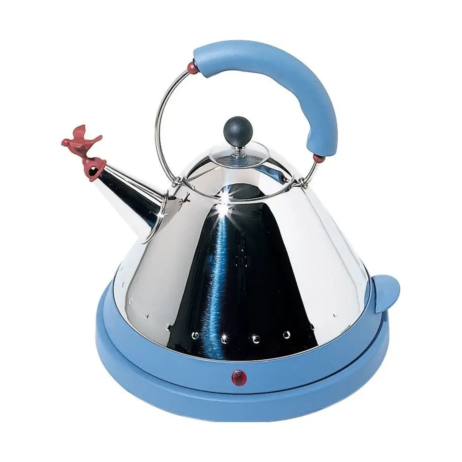 Denne Alessi-elkedel i poleret rustfrit stål med blå detaljer forener håndværk og funktionalitet. Den rummer 150 cl vand og er udstyret med en lille fugl på tuden, der giver kedlen sit karakteristiske udtryk.