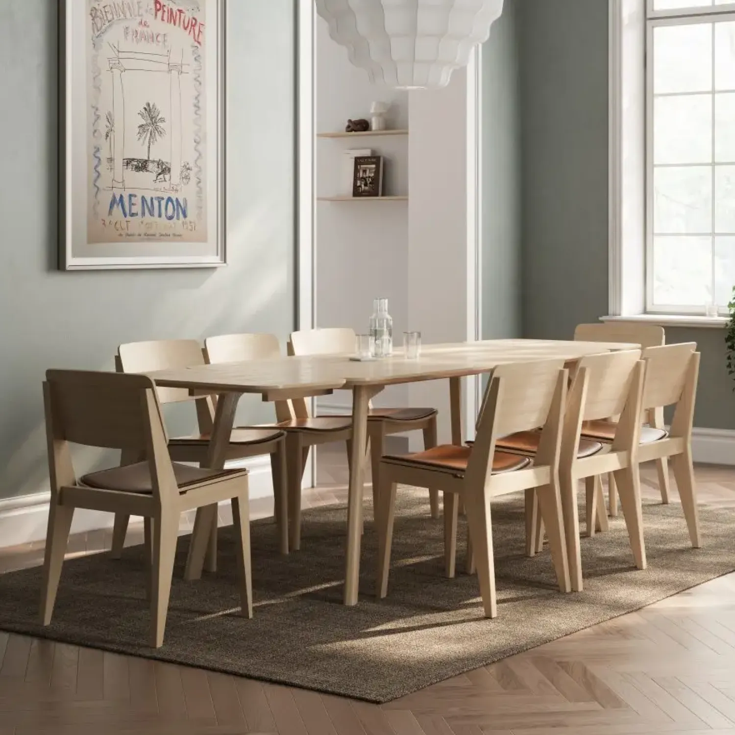 Spisebordet har en rektangulær form, der giver god plads omkring bordet. De skrå ben bidrager til bordets særprægede udseende og konstruktion. Med dimensioner på 180 cm i længden og 90 cm i bredden tilbyder bordet en rummelig overflade. Højden på 75 cm er standard for spiseborde. Disse mål gør bordet velegnet til forskellige rumstørrelser og indretninger.