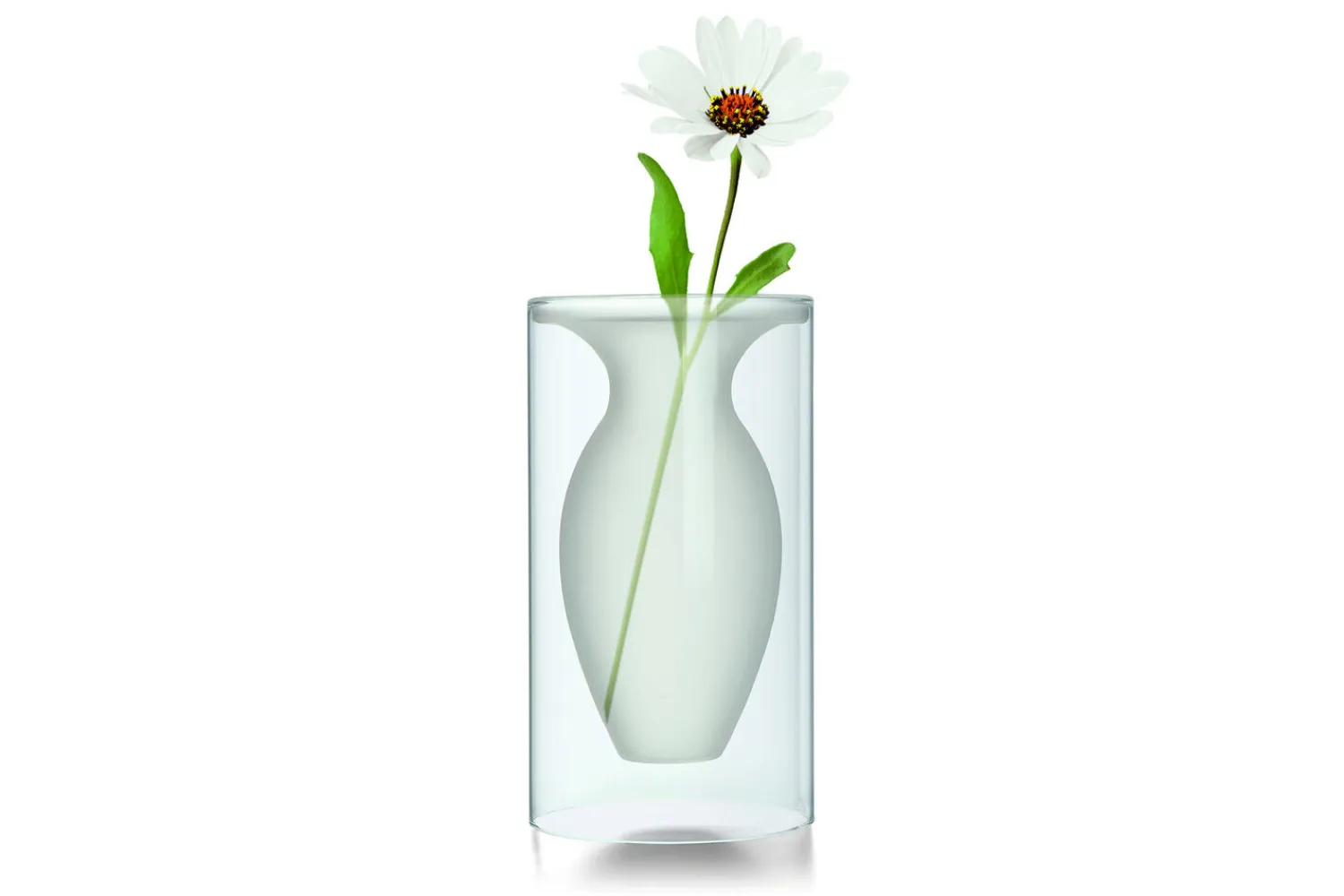 Den cylindriske ydre struktur omslutter en indre vase med aflang form og bred kant. Dette dobbelte design skaber en visuel kontrast mellem de to elementer. Vasens udformning gør den til et bemærkelsesværdigt stykke i indretningen.