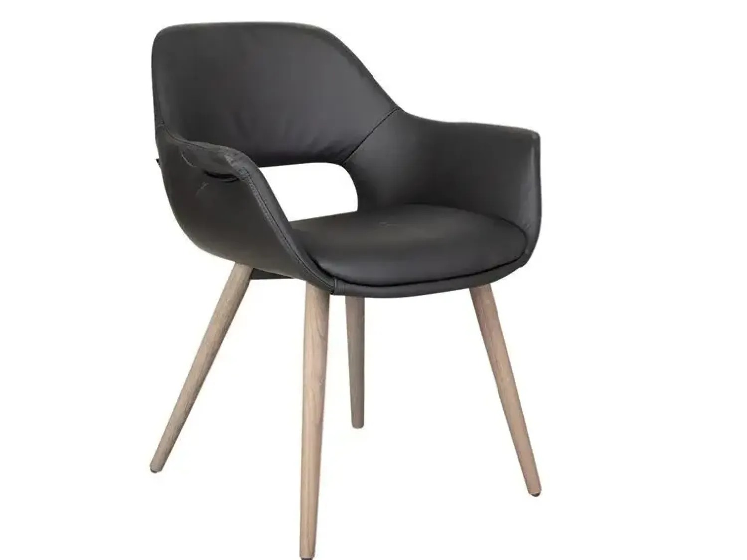 Fenja-stolen i sort læder kombinerer stilrent design med høj komfort og naturlige materialer. Det elegante sæde er polstret i slidstærkt sort læder, som både er nemt at vedligeholde og tilfører stolen et eksklusivt og tidløst udtryk. Den formstøbte skal med integrerede armlæn sikrer en behagelig siddeoplevelse, mens de solide træben skaber et varmt og indbydende helhedsindtryk. Træet kan olieres i en af vores forskellige olievarianter, så stolen kan tilpasses individuelle præferencer og indretninger. Varenummer: 27509 Mål: H 80 x B 63 x L 54 cm Siddehøjde: 48 cm Armlæns højde (fra gulv til hvor armlænet er højest): 62 cm Farve: Sort Materiale: Læder Vægt: 9,5 kg pr. stol Belastning: 125 kg