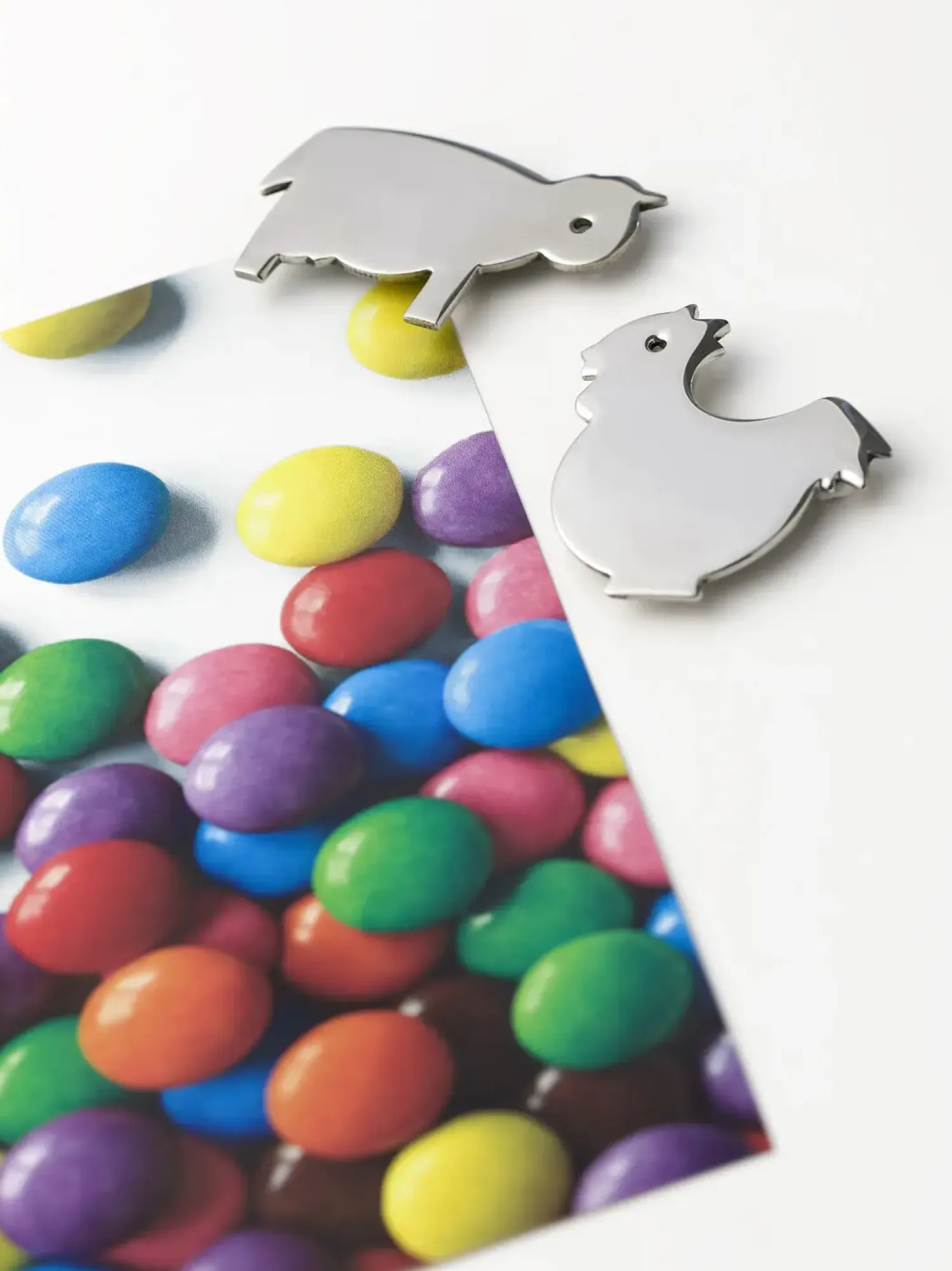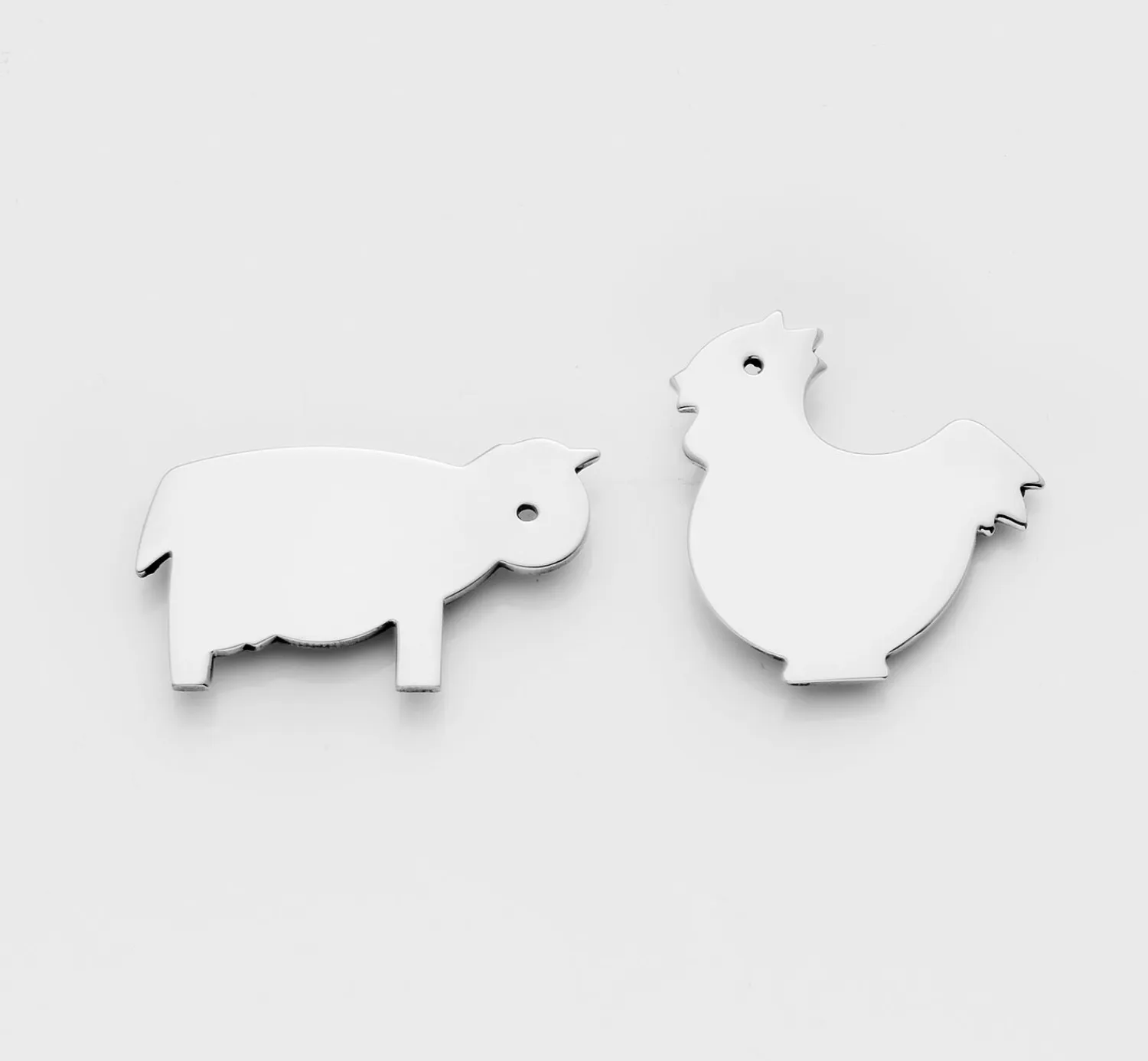 Disse charmerende magneter i form af en ko og en kylling tilføjer et legende præg til din køkkenindretning. Fremstillet i poleret rustfrit stål kombinerer de dekorativ stil med praktisk funktionalitet til daglig brug.