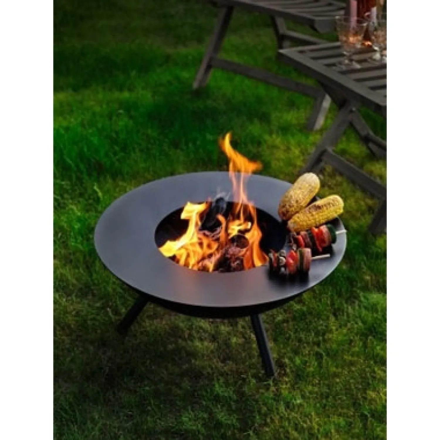 Det medfølgende låg og tang er designet til at lette håndteringen af både ild og mad. De hævede ben bidrager til øget stabilitet på forskellige underlag. Produktets kompakte størrelse på 56 x 56 x 29 cm gør det egnet til mange udendørs områder. Dette bålsted er udviklet til at understøtte forskellige typer af udendørs sammenkomster, fra mindre middage til større forsamlinger.