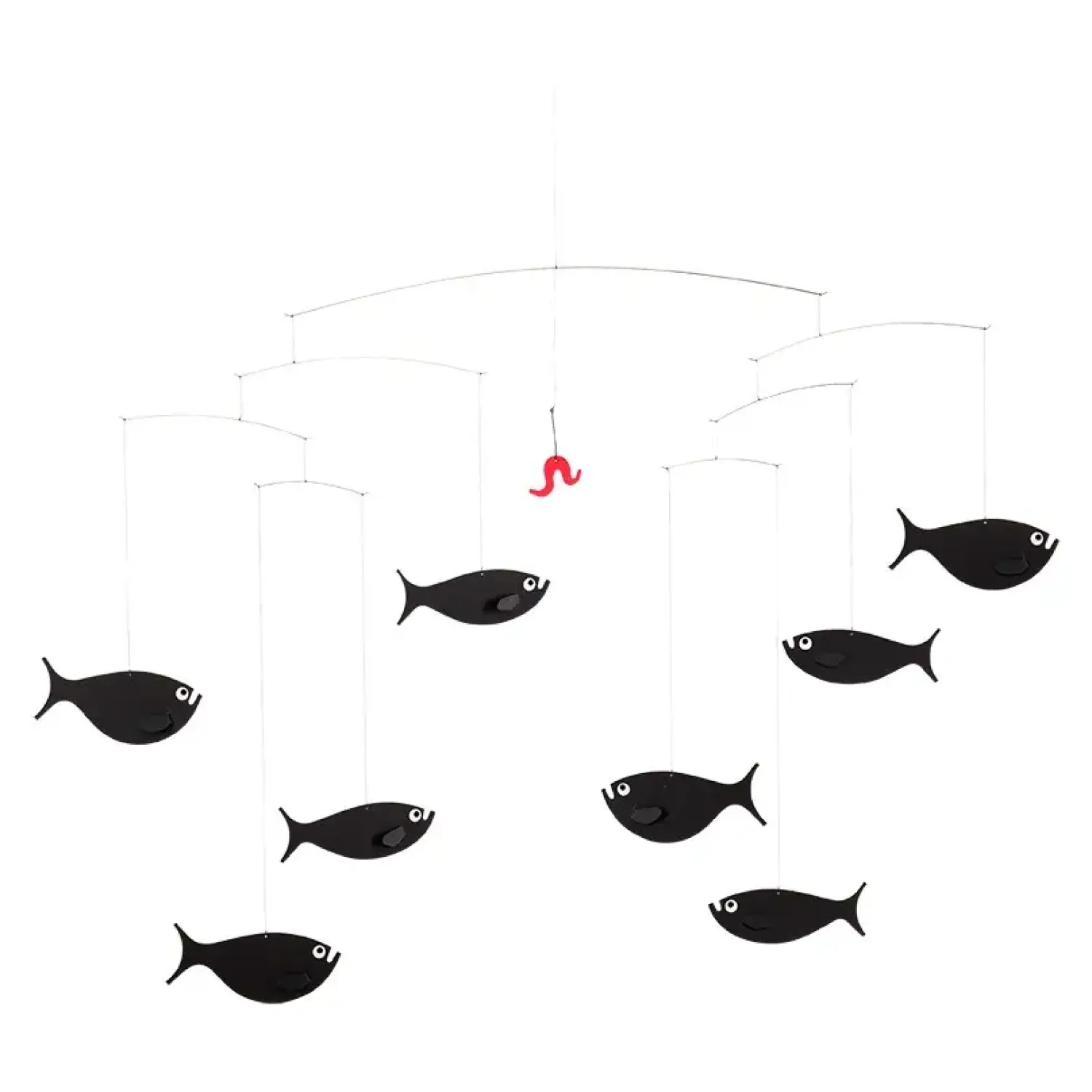 En sjov mobile fra Flensted hanging art, hvor fiskenes bevægelser får det til at se ud som de lokkes af den lille røde orm, der dingler på krogen. Perfekt til at hænge på børneværelset, i vinduet eller i et af hjørnerne i i dit hjem.