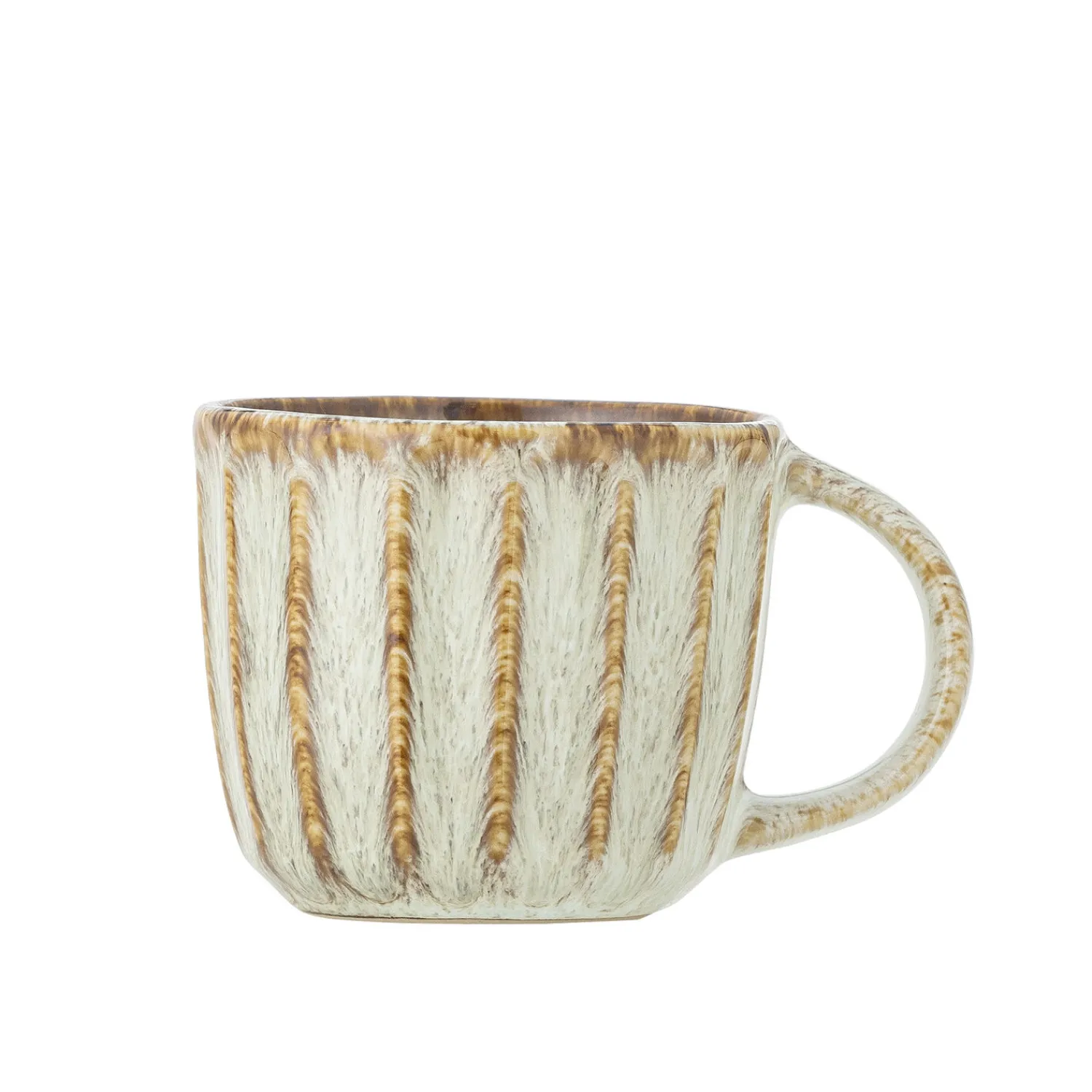 Den håndlavede glasur giver naturlige farvevariationer, hvilket betyder, at hver kop får sit eget særpræg. Kombinationen af lyse og mørkere nuancer skaber et roligt og jordnært udtryk, der passer ind i enhver indretning.