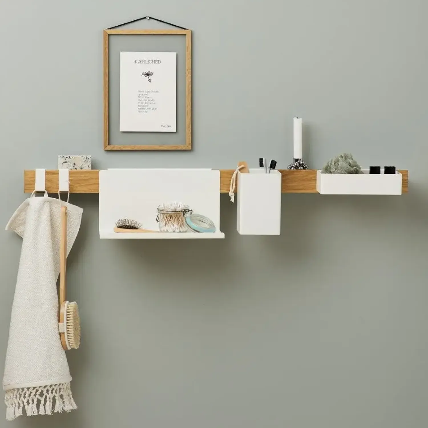 Flex er en multifunktionel opbevaringshyldesom passer til resten af flex systemet fra Gejst. Flex er lavet med fokus på materialer af høj kvalitet og kombinerer en magnetstrimmel, hylde, kroge og kasser. Det er nemt at udskifte de forskellige elementer så du kan vælge den opsætning, der virker for dig.