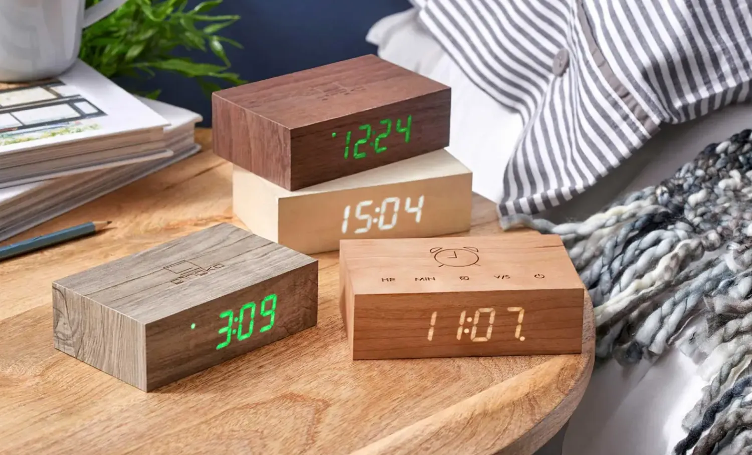 Dette vækkeur kombinerer naturlig kirsebærtræfinish med smart funktionalitet. Det måler 11,5 x 7 x 3,5 cm og passer på de fleste natborde. Det lydaktiverede ursystem slukker automatisk displayet i stilhed, hvilket reducerer unødvendig lysforurening om natten og sparer energi.