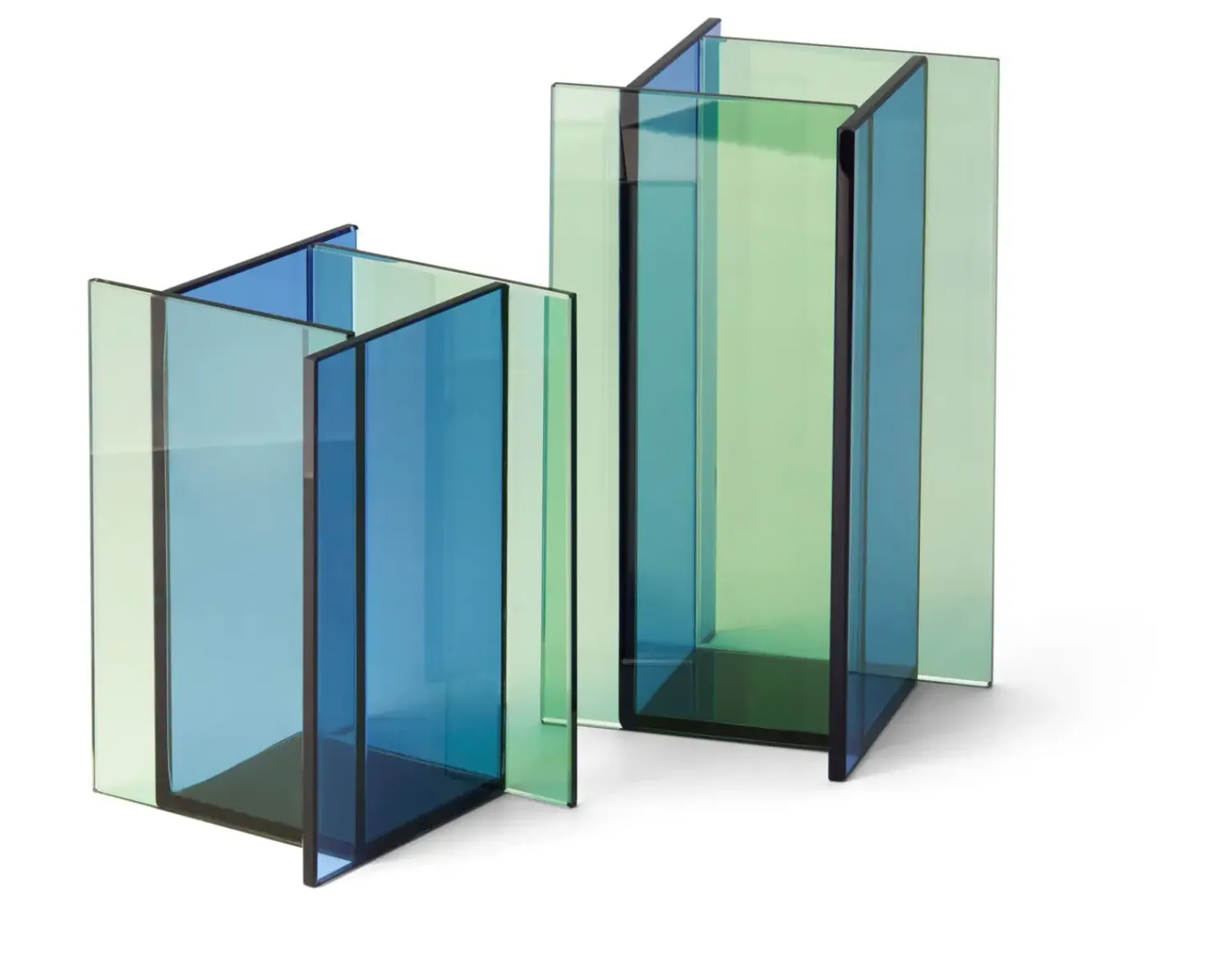 Fly vase S udmærker sig ved sin særlige konstruktion med overlappende paneler. Denne særprægede opbygning skaber et interessant visuelt udtryk, der kan variere afhængigt af synsvinklen. De solide glasark i to forskellige farver giver vasen dybde og karakter. Kombinationen af form og materiale gør vasen til et bemærkelsesværdigt stykke, der kan tiltrække opmærksomhed i ethvert rum.