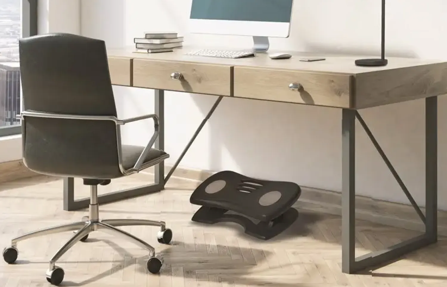 Ergonomisk fodstøtte udarbejdet i samarbejde med ” Industrial Medicine”. ved at bruge Nymphea undgår man kramper og øger blodcirkulationen. Hældning kan justeres efter ønske 0 til 20 grader. Højden kan justeres fra 8 – 20 cm. Mål L 42 x B 32 cm