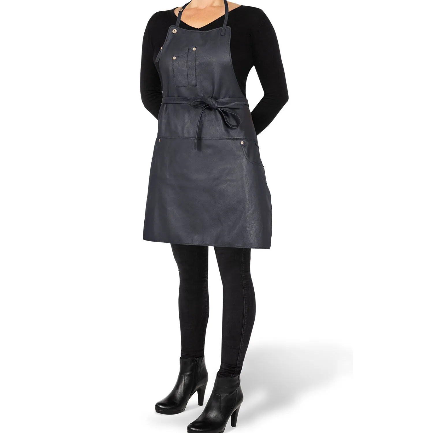 Baseret på pasformen på dine yndlingsjeans, er dette nye læderforklæde med fem lommer og slim fit det ultimative hollandske luksusdesign. Kombiner mode og mad som aldrig før! Denne slankere stil har et mere figursyet look, opnået med den rundede halsudskæring, slankere sidepaneler og en kortere længde. Snørerne kan bruges til at binde forklædet foran eller bagpå. Placeringen af de fem lommer refererer stærkt til jeansdesign: to mindre foran og to store på siden, med den berømte lille urlomme på den ene side. Lavet af 100% fuldnarvet, draperende læder og afsluttet med en transparent, vandafvisende belægning. Lav en læderkjole ved at binde stropperne foran og have den på hele natten, mens du er fuldt beskyttet under madlavningen. For alle med en passion for mad og design. Forklæderne er færdige med messingnitter, knapper og meget behagelige stropper. Din nye favorit nogensinde! Fem lommer – Lille lomme foran til en kuglepen og dine briller, to store i siden og den berømte lille urlomme med guldkronelogo. Slim fit: Denne slankere model har et mere figursyet look, opnået med den rundede halsudskæring, slankere sidepaneler og en kortere længde. Snørerne kan bruges til at binde forklædet foran eller bagpå. Færdig med messingnitter, knapper og meget behagelige stropper. Fås i tre farver: Klassisk sort, klassisk brun og perlerosa. 100% fuldnarvet læder med REACH-certifikat – fri for skadelige kemikalier.