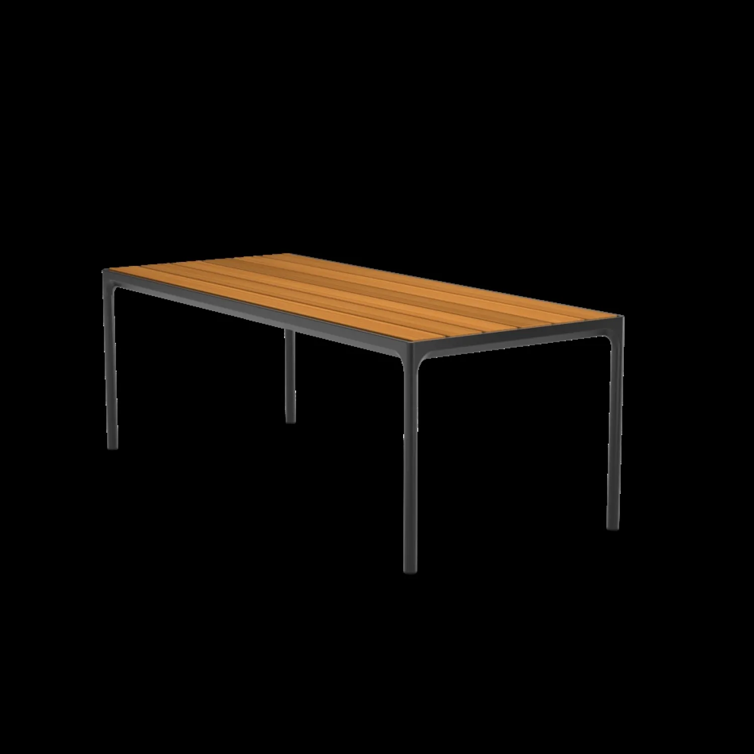 Udendørsbord med bambusplade og metalramme. Designet til brug i forskellige miljøer. Kombinerer slidstyrke med et naturligt udseende. Rammestrukturen giver stabilitet under forskellige forhold.