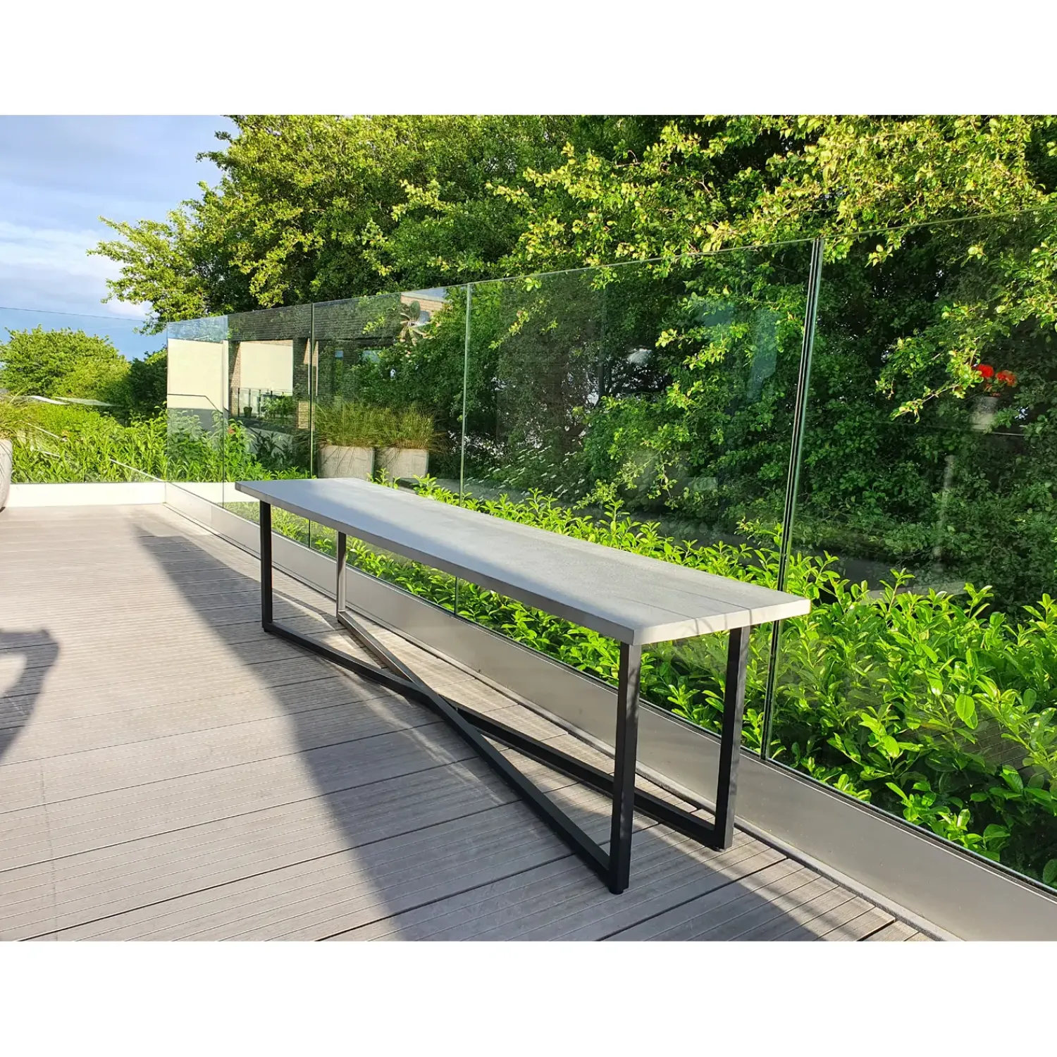 Pladen er i fibercement med sorte ben i stål.