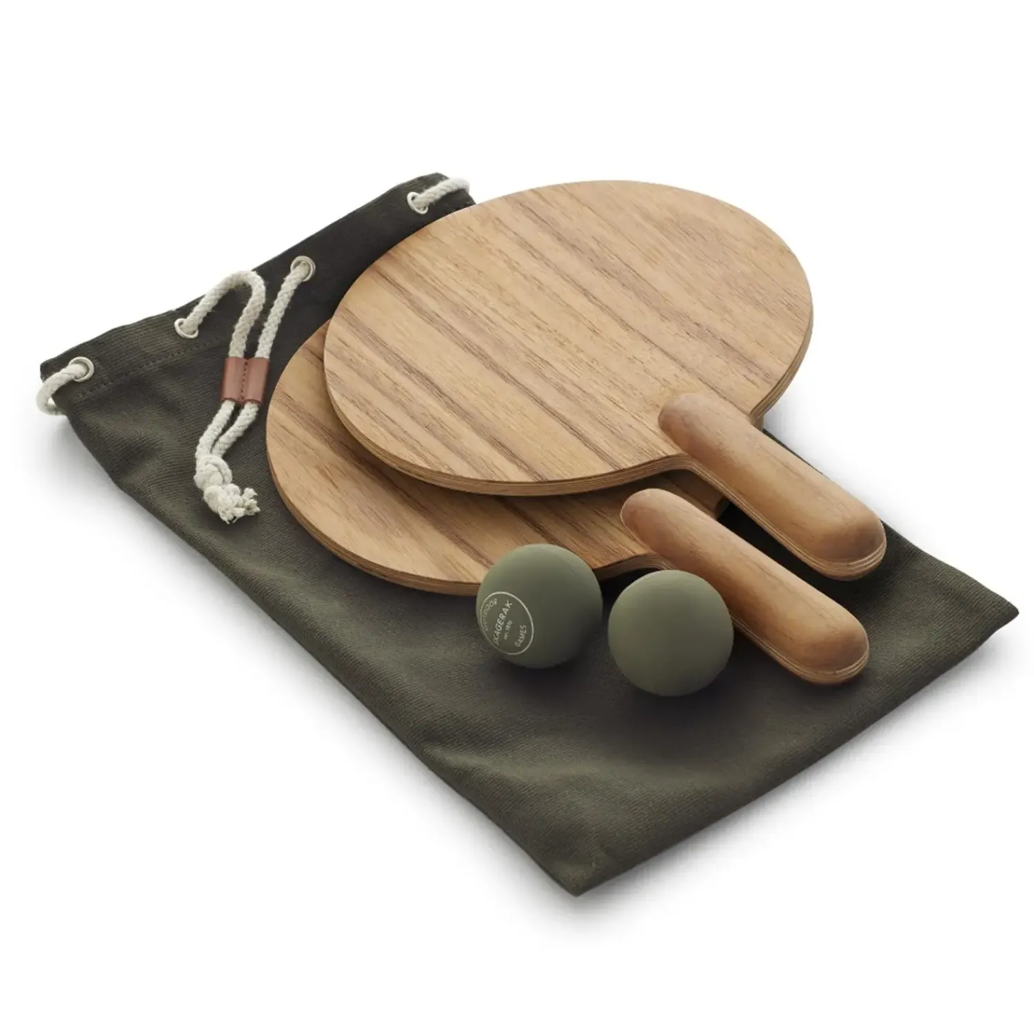 Med dette strandtennissæt fra Fritz Hansen kan du nyde en herlig dag ved stranden. Sættet indeholder to træksæt med naturlig træfinish og ergonomiske håndtag samt to mørkegrå gummibolde. Det kommer i en praktisk lærredspose, og der er mulighed for at tilkøbe flere bolde efter behov.