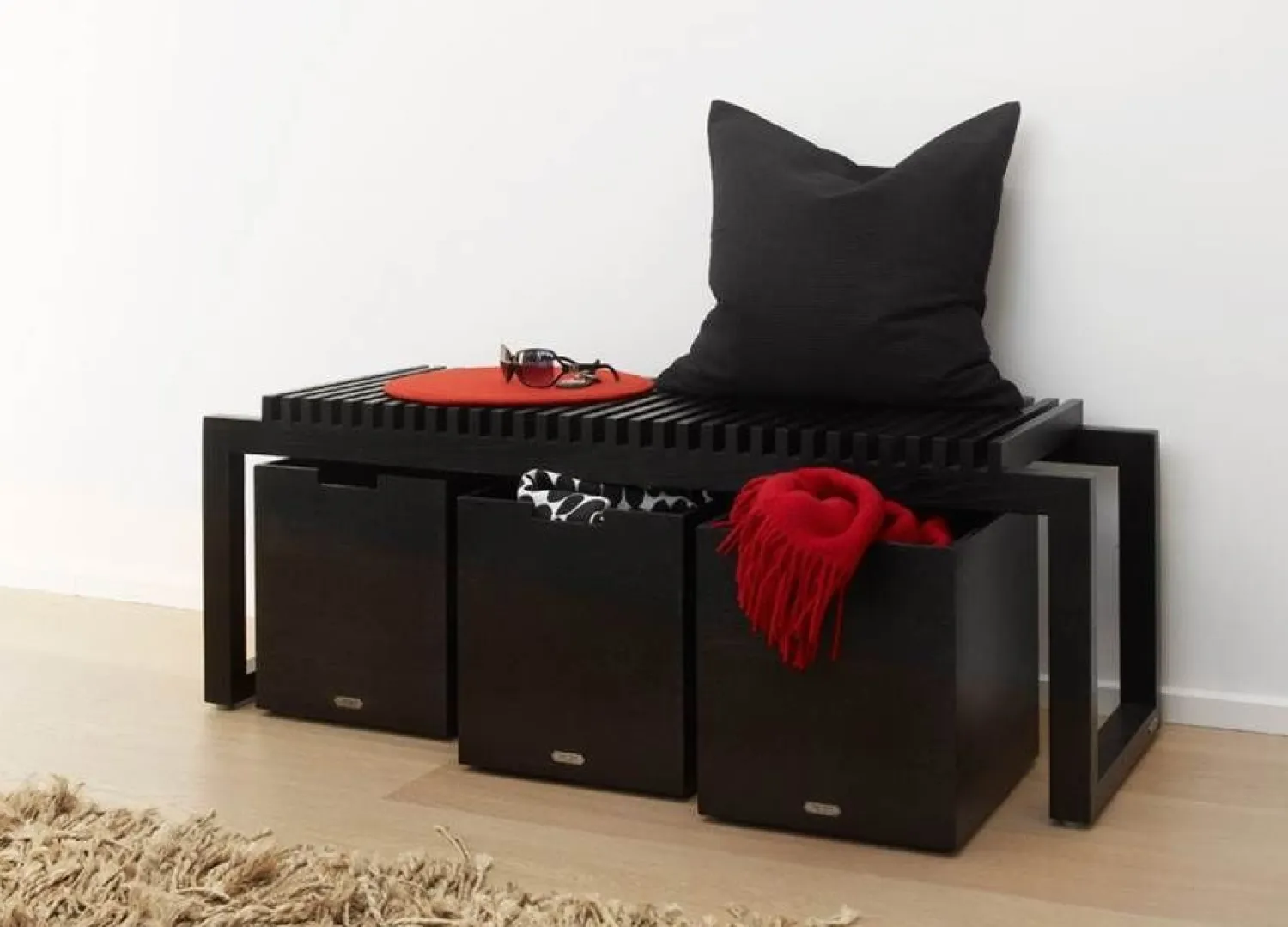 Denne bænk er fremstillet af sortbejdset eg, et materiale der sikrer både holdbarhed og et moderne udtryk. Det sorte design passer ind i mange forskellige indretninger, og lamelstrukturen på sædet giver en karakteristisk profil.