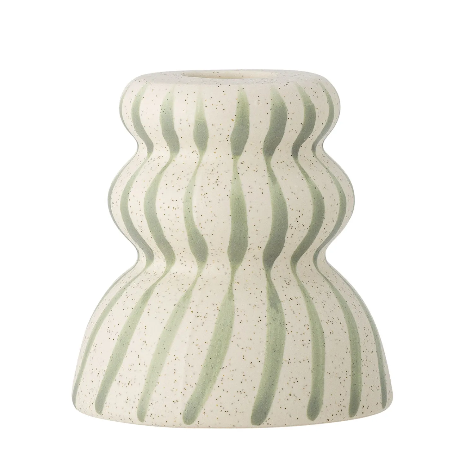 Denne hånddekorerede lysestage fra Bloomingville kombinerer traditionelt håndværk med holdbart stentøj. De bølgede mønstre og skiftende nuancer mellem lys- og mørkegrøn gør hver lysestage særpræget, mens den robuste konstruktion sikrer lang holdbarhed.
