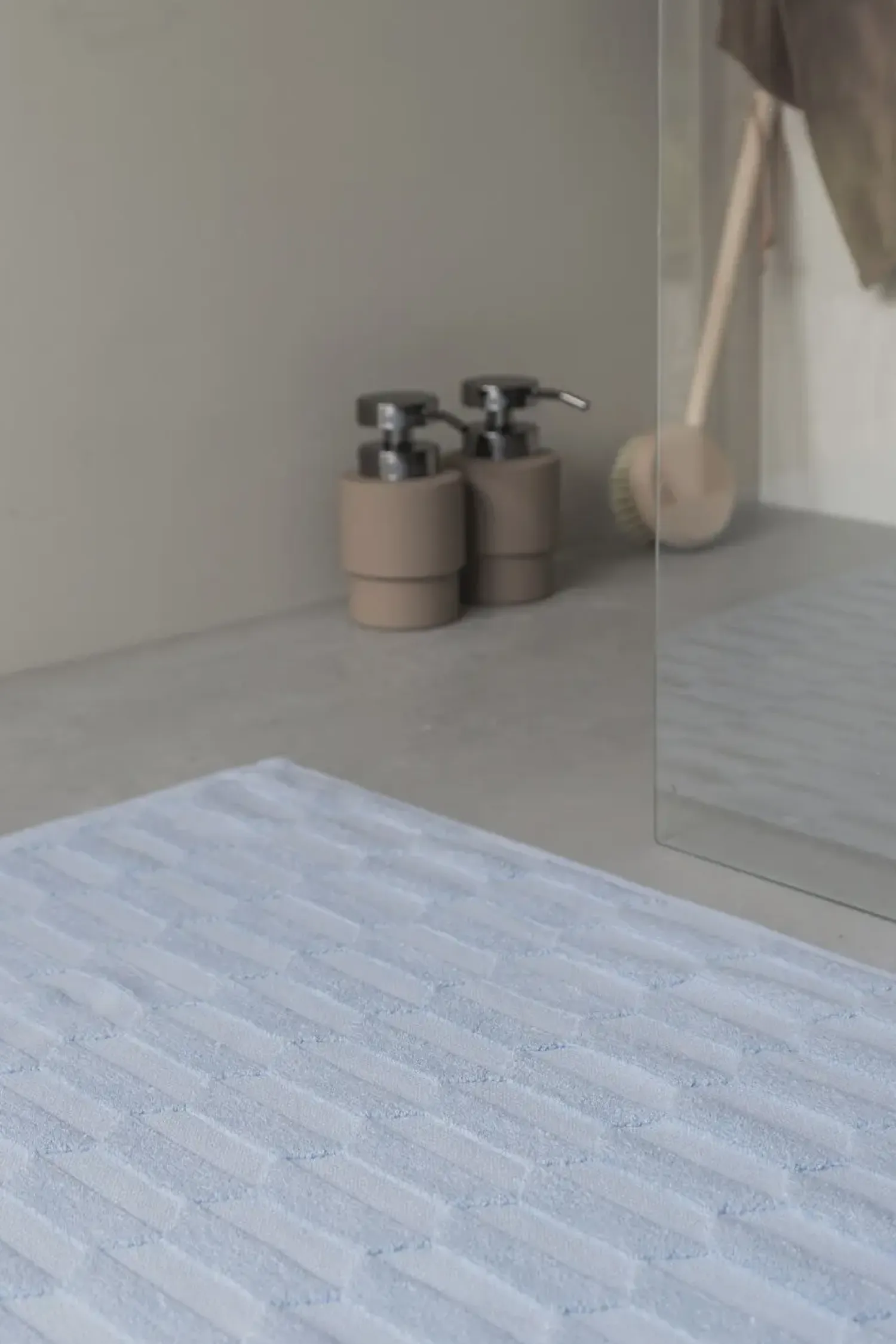 Tilføj et strejf af elegance og funktionalitet til dit badeværelse med Mette Ditmer GEO-bademåtten i en klar lyseblå farve. Den er lavet med en høj-lav vævningsteknik, som skaber et næsten tredimensionelt, grafisk mønster. Den sekskantede form, opdelt i lyse og mørke halvdele, giver en visuel dybde og en unik tekstur.
