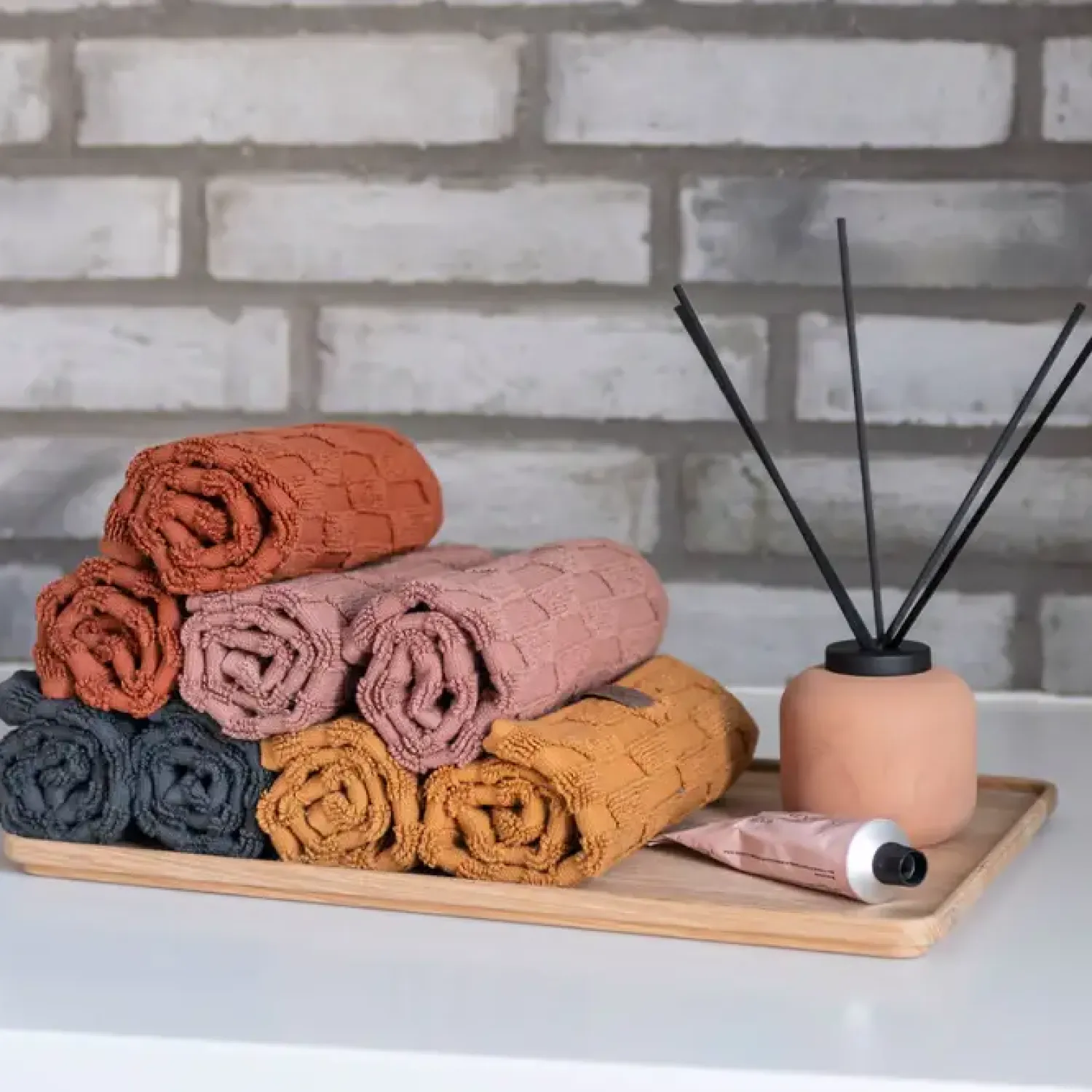 Stabl de foldede minihåndklæder på en bakke ved siden af vasken, eller rul dem sammen og fremhæv dem i en smuk kurv. Det er dekorativt, indbydende og skaber velvære på badeværelset. Fuldend stilen med badehåndklæder og bademåtte i GEO-serien, og match med sæbedispenser og tandbørsteholder i samme farveskala.