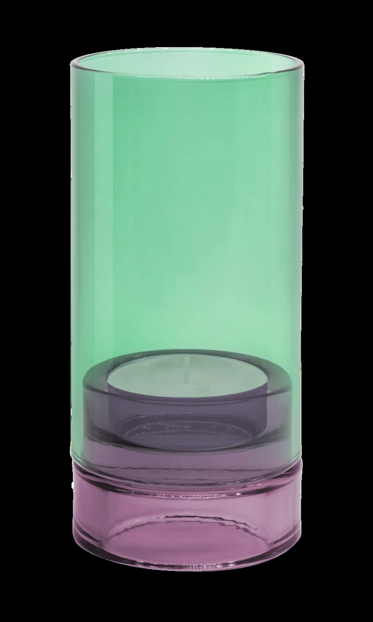 Lanternen lys er mere end blot en lysholder. Den cylindriske form giver stabilitet, mens det håndblæste glas sikrer, at hvert stykke er unikt. Placer et fyrfadslys indeni cylinderen eller oven på bunden for forskellige belysningseffekter. Kombinationen af aqua og lilla sektioner skaber en harmonisk balance, der komplementerer moderne indretning.