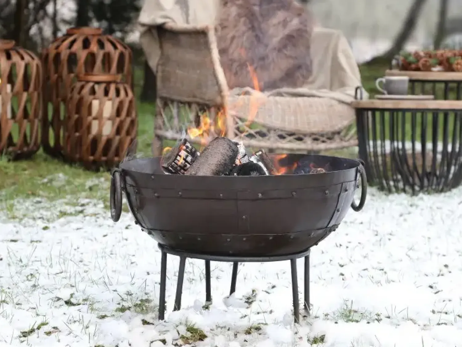Dette håndlavede bålfad i jern bringer varme til din terrasse. Den runde skålform på 52 cm skaber samlingspunkter, mens de buede ben sikrer stabil placering på forskellige underlag.