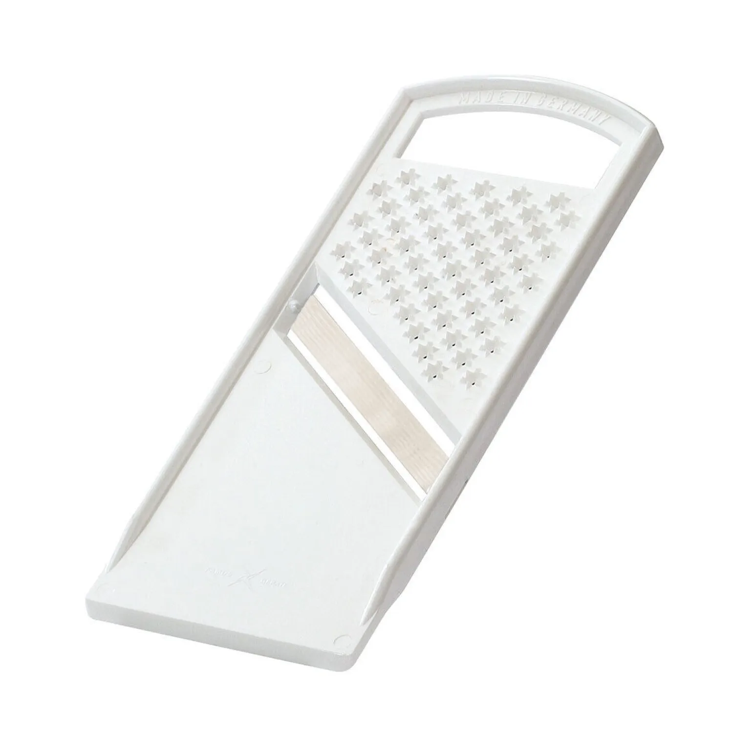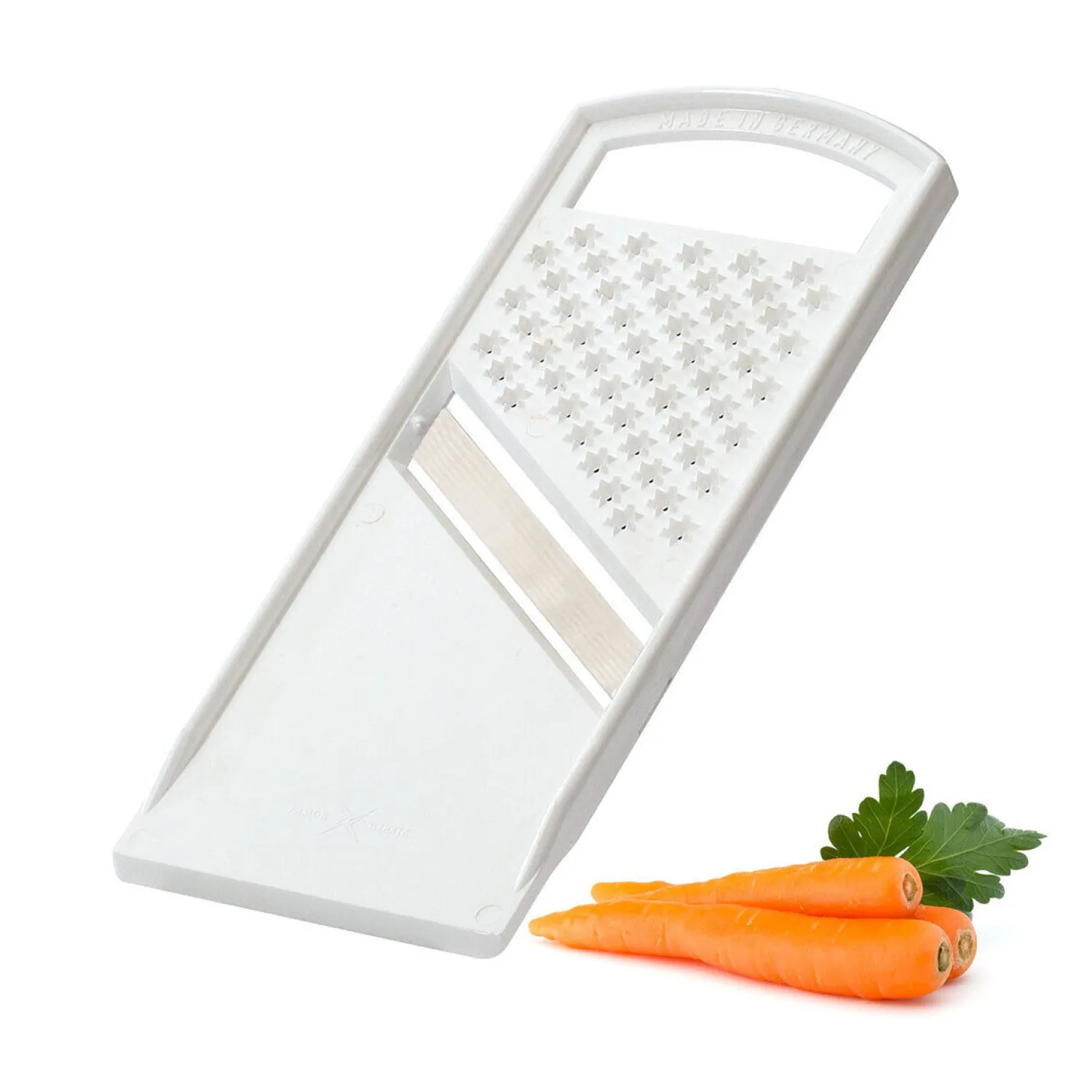 Westmark – Grøntsagsskærer – Küchenmaid er et alsidigt køkkenredskab, der kombinerer to funktioner i ét kompakt design. Dette tosidede værktøj byder på en fin rivningsflade til ost, krydderier og frugt på den ene side og et skæreområde med en præcis, lige kant til snit af grøntsager på den anden. Redskabet er designet til at være praktisk og effektivt i køkkenet.