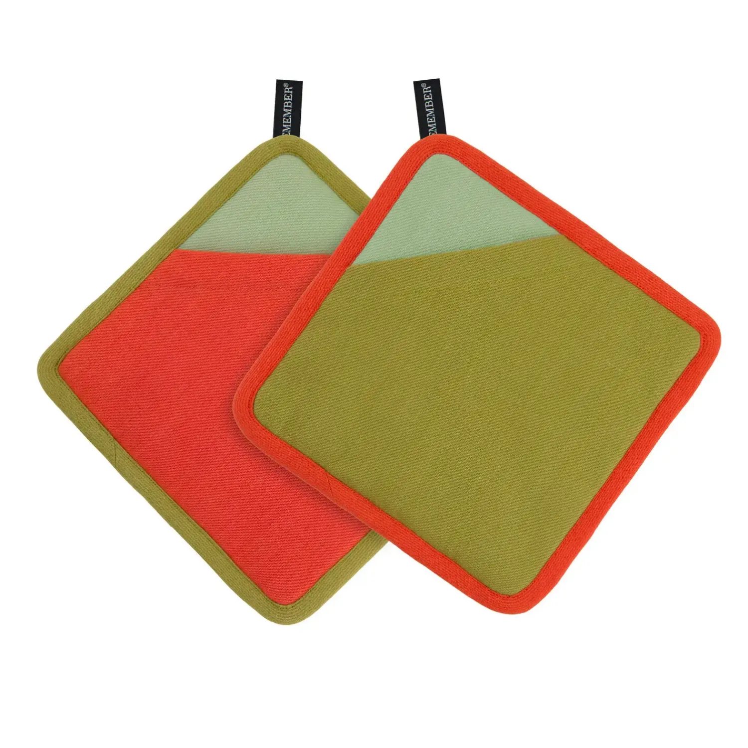 Det geometriske mønster i grøn, rød og orange giver grydelapperne et distinkt udseende. Disse farver kan tilføje et interessant visuelt element til dit køkken. Remember grydelapper kombinerer således funktionalitet med et farverigt design, der gør dem til et praktisk og dekorativt tilbehør i ethvert køkken.