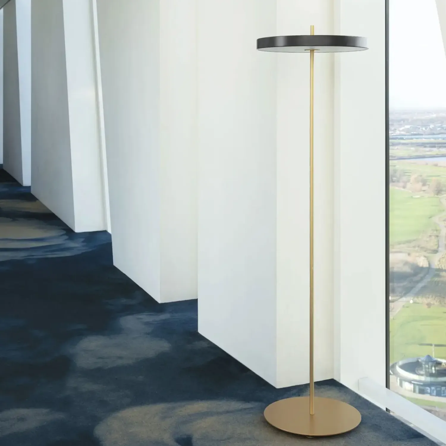 Med sit minimalistiske udtryk går den flotte Asteria Floor gulvlampe fra Umage aldrig af mode. Den gennemgående messingbase er med til at forstærke det enkle og elegante udtryk.