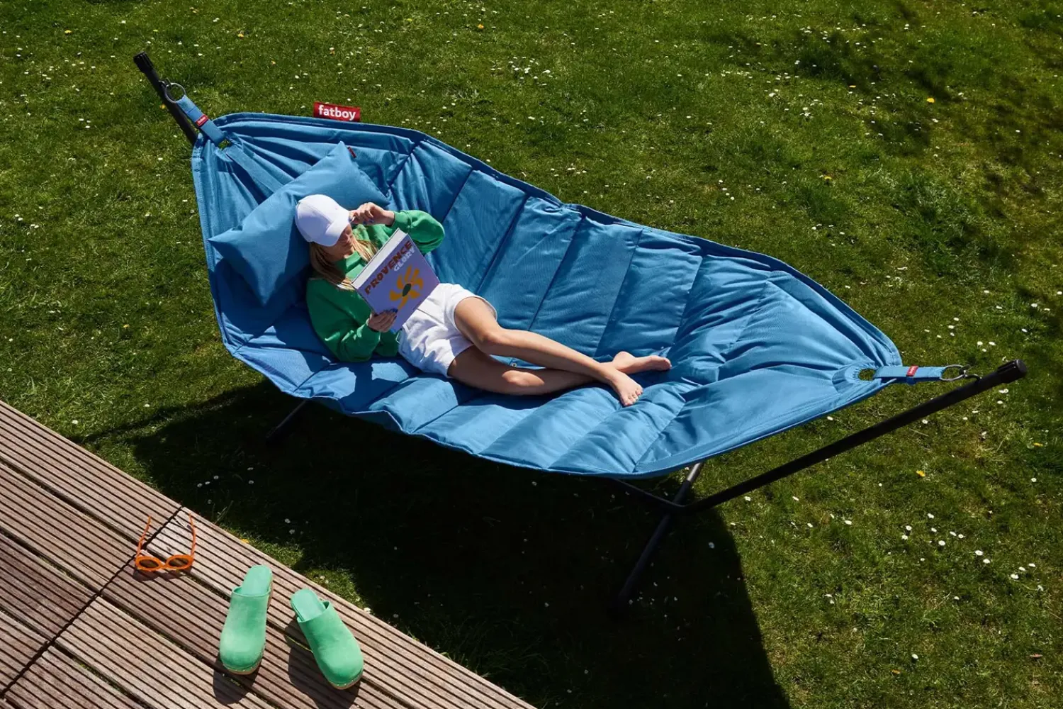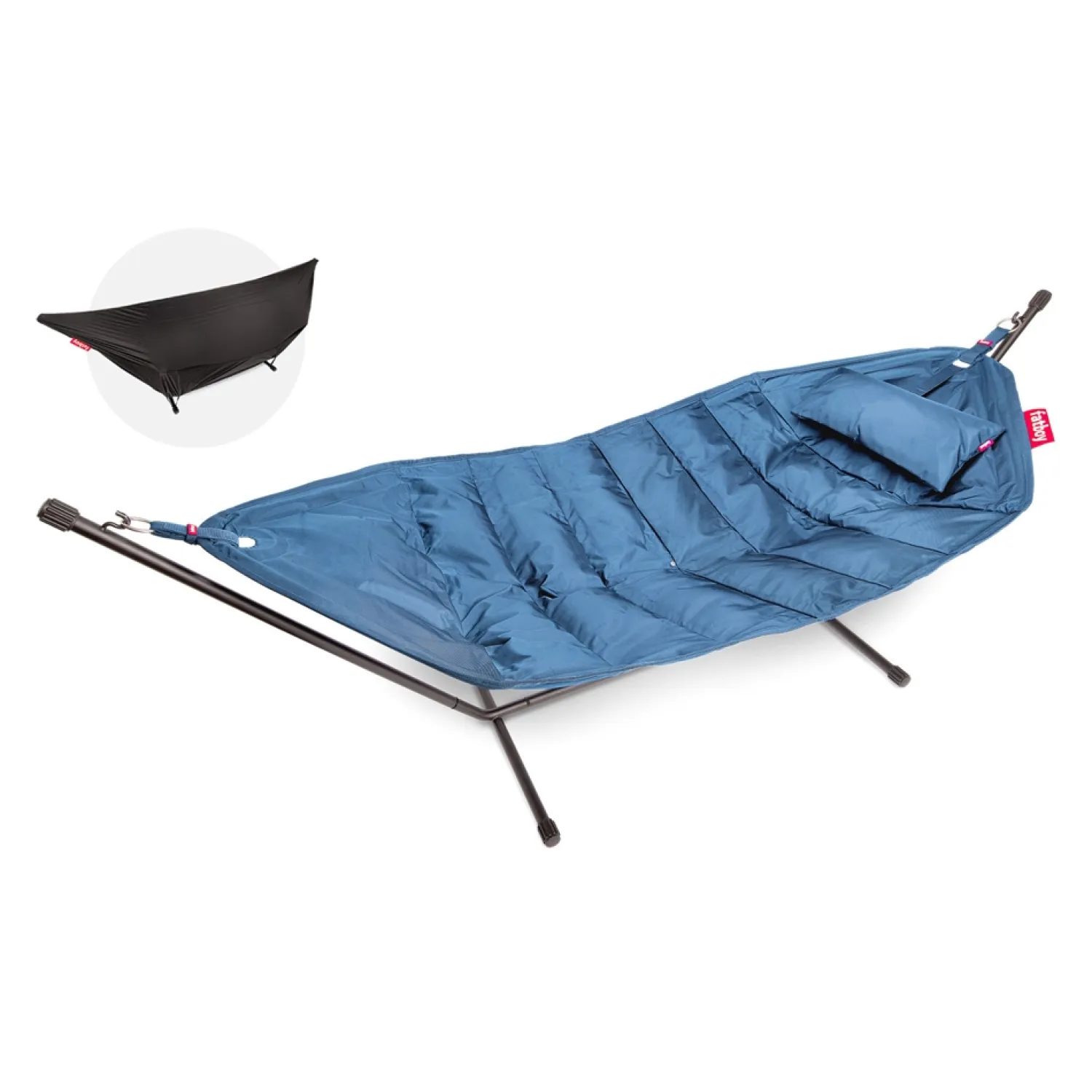 Dette sæt fra Fatboy inkluderer en lyseblå hængekøje med matchende pude, en sort metalramme og et praktisk regncover. Hængekøjen måler 270 x 138 cm og giver god plads til afslapning. Den kan bære op til 150 kg.