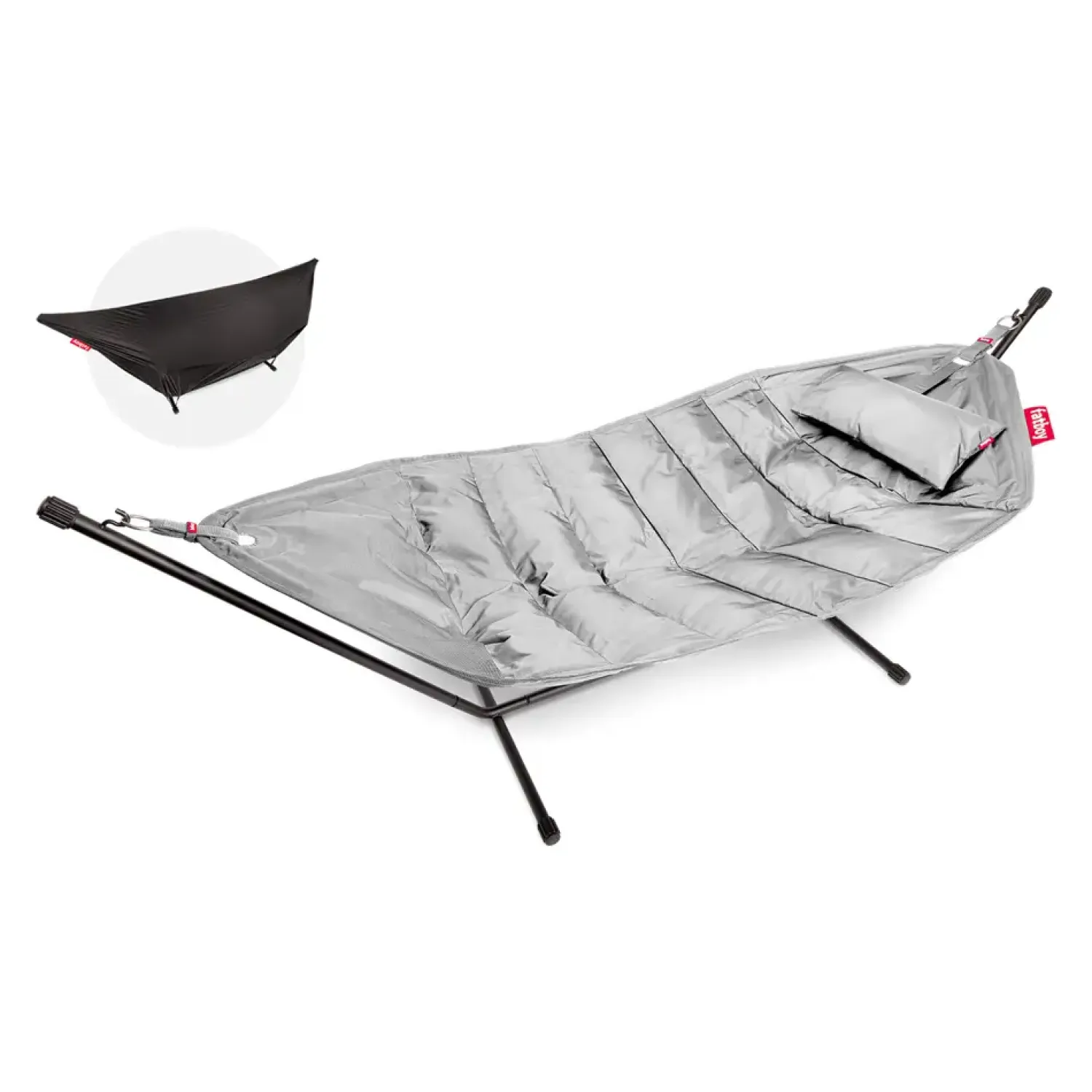 Denne hængekøjeløsning giver dig en rummelig hængekøje med pude og regncover. Den stærke opbygning kan bære op til 150 kg, så du kan slappe af uden bekymringer. Materialerne af polyester, metal og gummi sikrer lang holdbarhed.