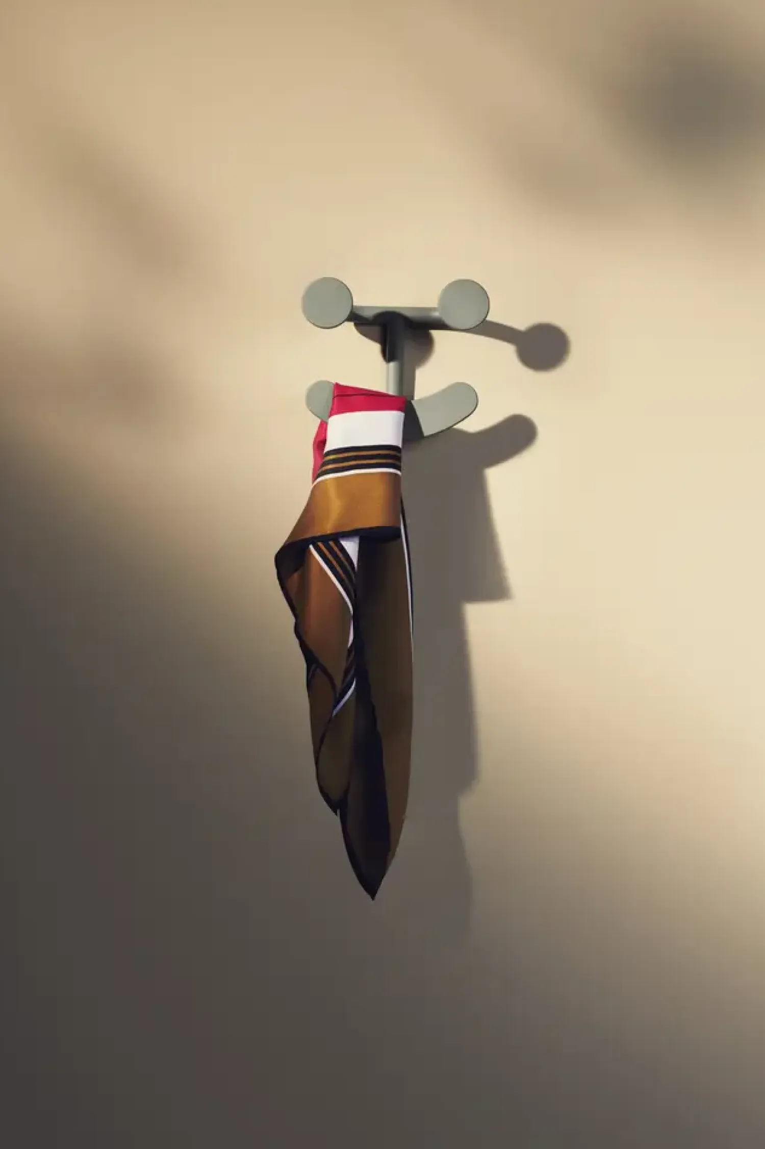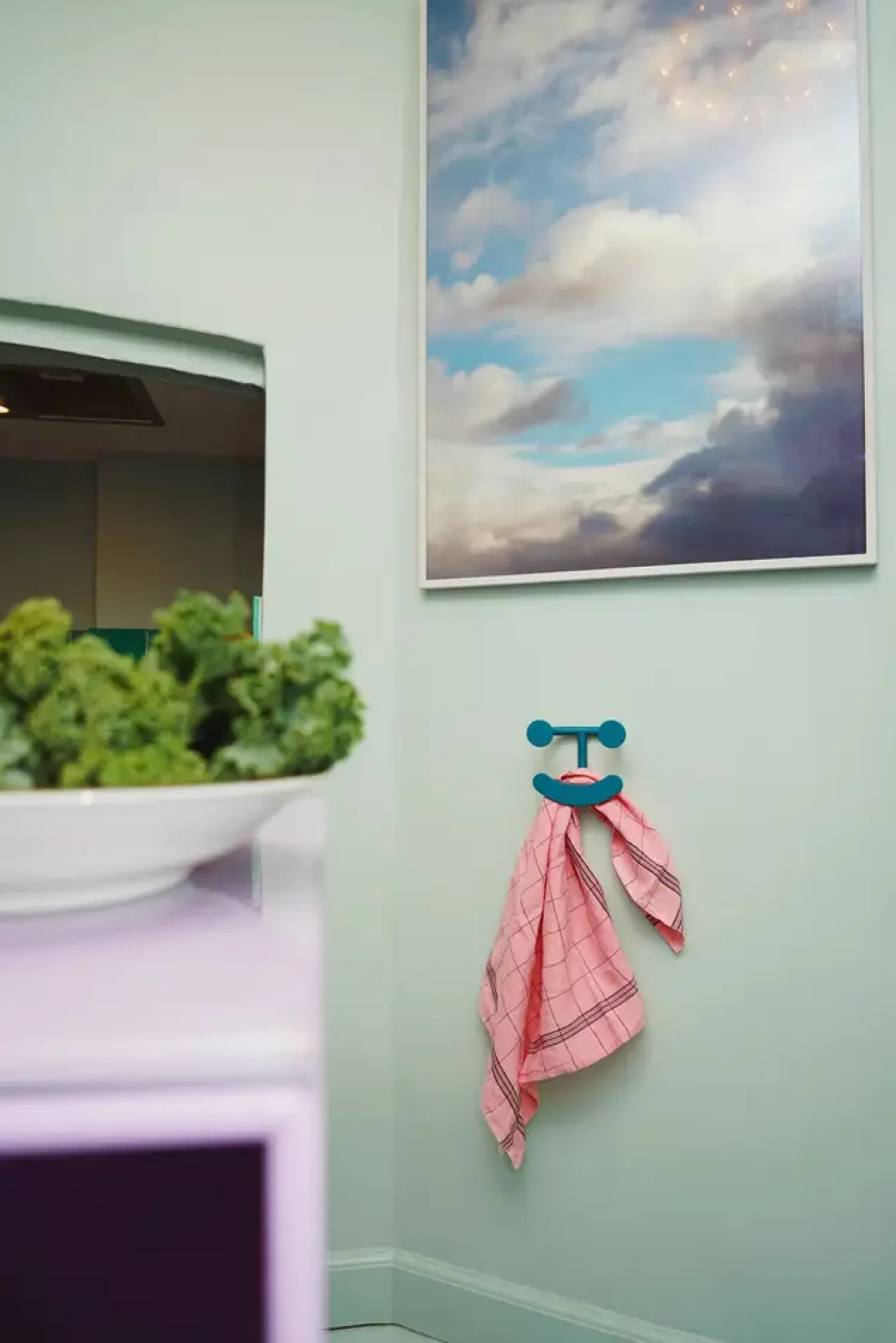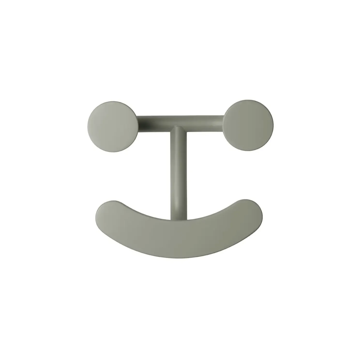 Den karakteristiske form, der minder om et smilende ansigt, tilføjer et personligt præg til dit rum. Den buede nederste del og de to runde knager gør det nemt at hænge forskellige typer tøj. Den grøn-grå farve passer ind i mange indretningsstile uden at dominere.