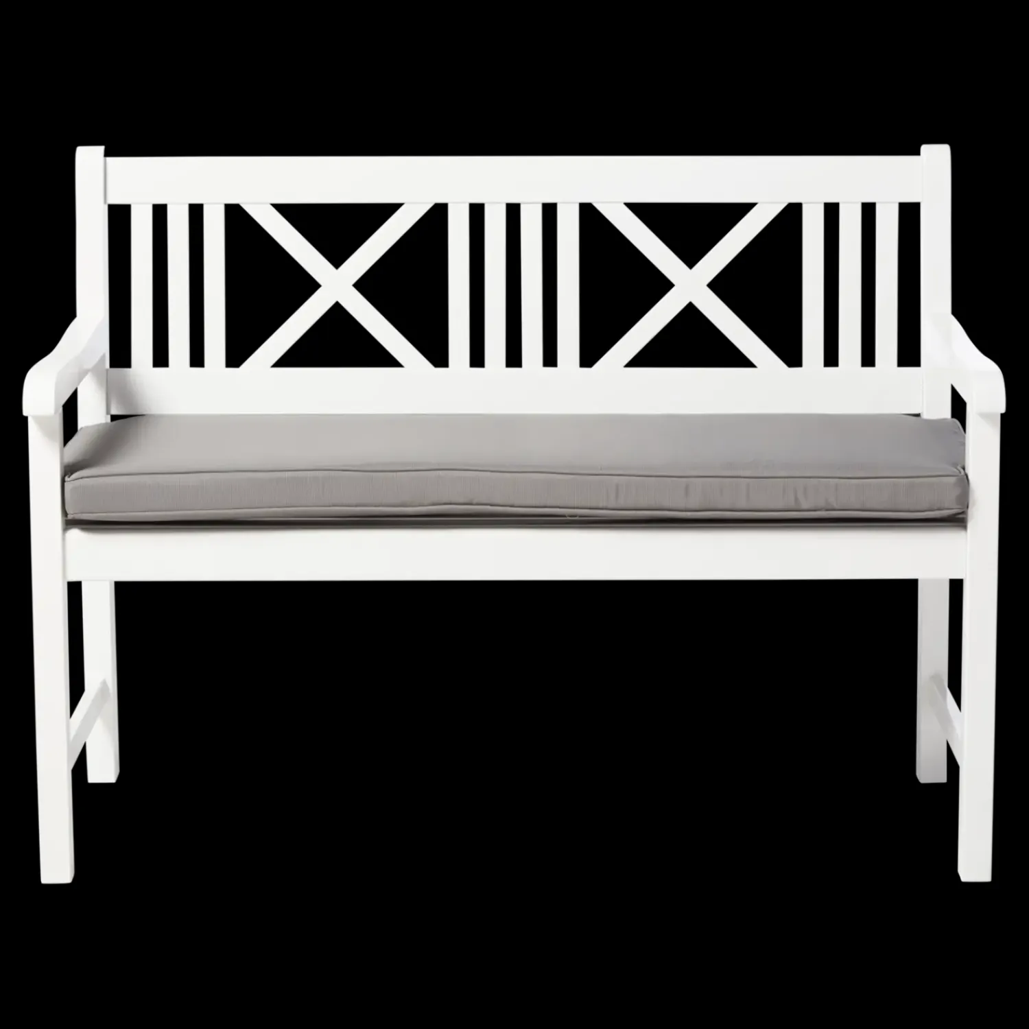 Bænken er konstrueret af mahogni, hvilket bidrager til dens robusthed. Den hvide PU-glansmaling giver bænken et distinkt udseende og gør den vandtæt, hvilket øger dens modstandsdygtighed over for vejr og vind. Rygstøtten med X-formede designelementer og armlæn er inkluderet for at tilbyde støtte til brugerne.