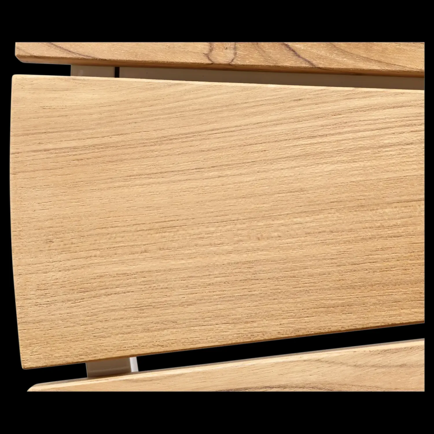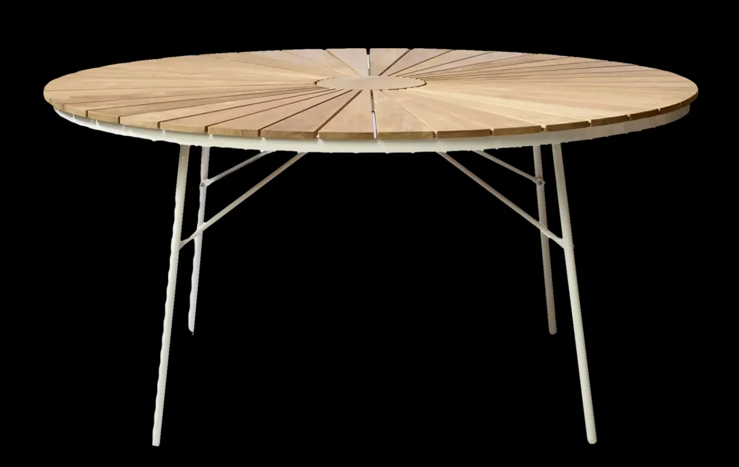 - Rund bordplade med teaktræs lameller.