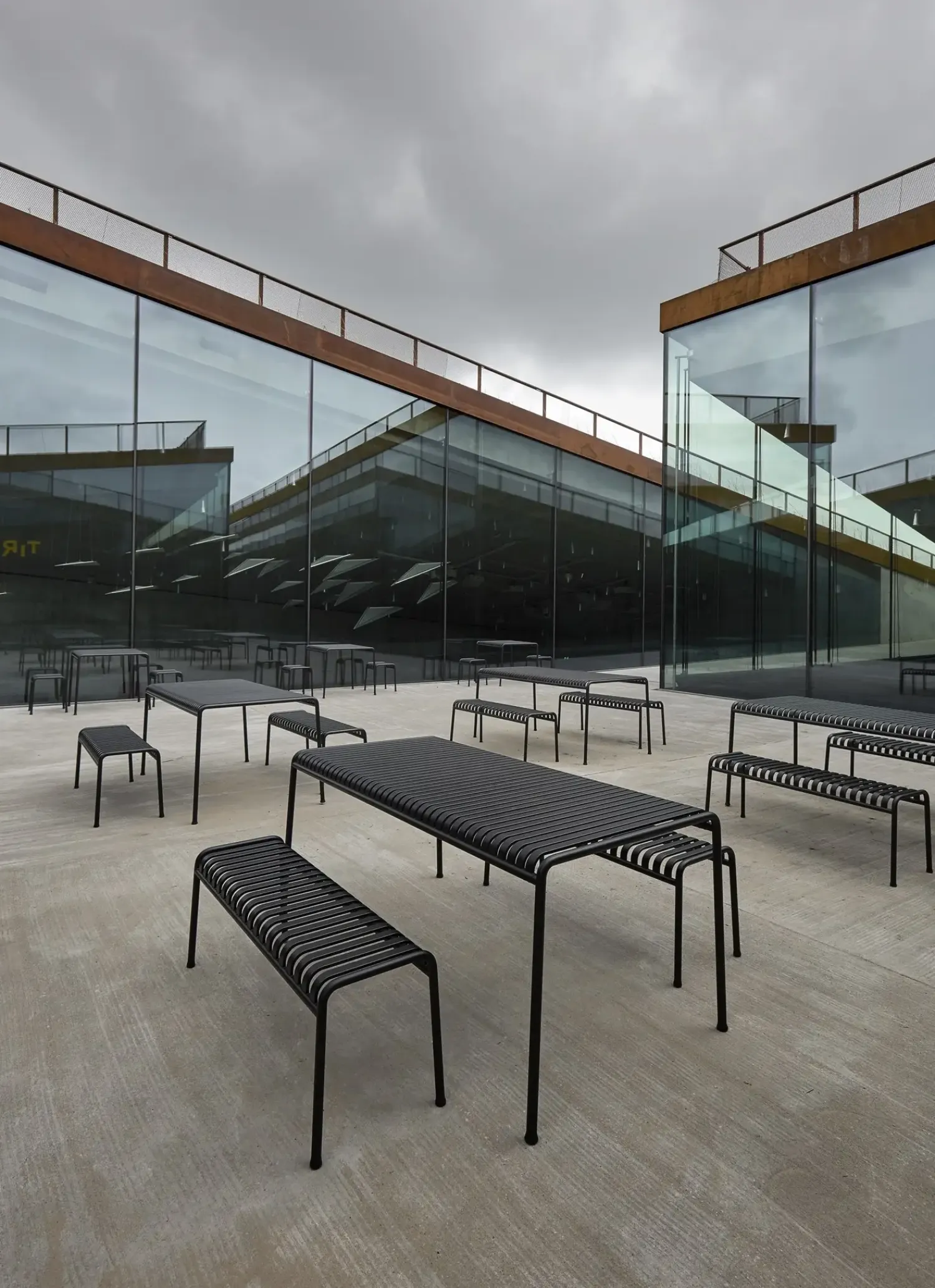 Palissade-bordet er fremstillet af elektrogalvaniseret, pulverlakeret stål, hvilket sikrer høj holdbarhed og lang levetid. Dette materiale giver bordet en glat, ensartet overflade i en dyb antracitfarve. Lameldesignet på bordpladen tilfører en interessant tekstur og letter rengøringen. De fire slanke ben giver bordet et let udtryk, samtidig med at de yder solid støtte.