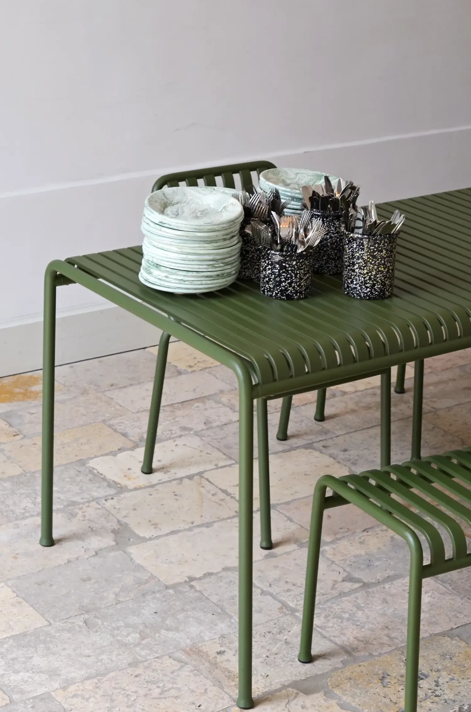 HAY havebord – Palissade bord – Large kendetegnes ved sin robuste konstruktion og praktiske udformning. Den rektangulære bordplade med lameldesign giver en interessant visuel effekt, mens de fire slanke, lige ben sikrer stabilitet. Bordets olivengrønne farve passer godt ind i naturlige omgivelser og kan tilføje et friskt præg til din udendørsindretning. Den elektrogalvaniserede og pulverlakerede stålkonstruktion gør bordet vejrbestandigt og vandtæt, hvilket bidrager til dets holdbarhed over tid, selv under skiftende vejrforhold og i kontakt med vand.