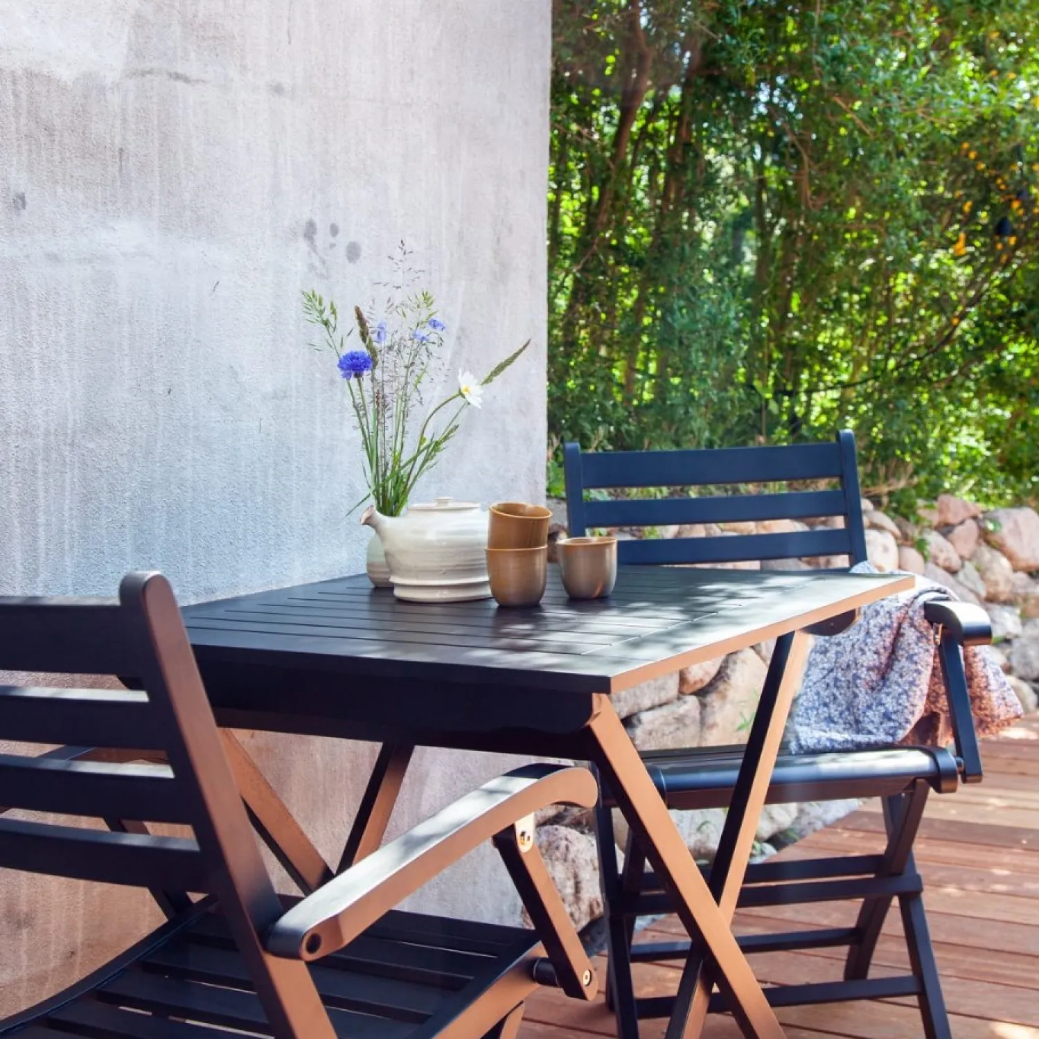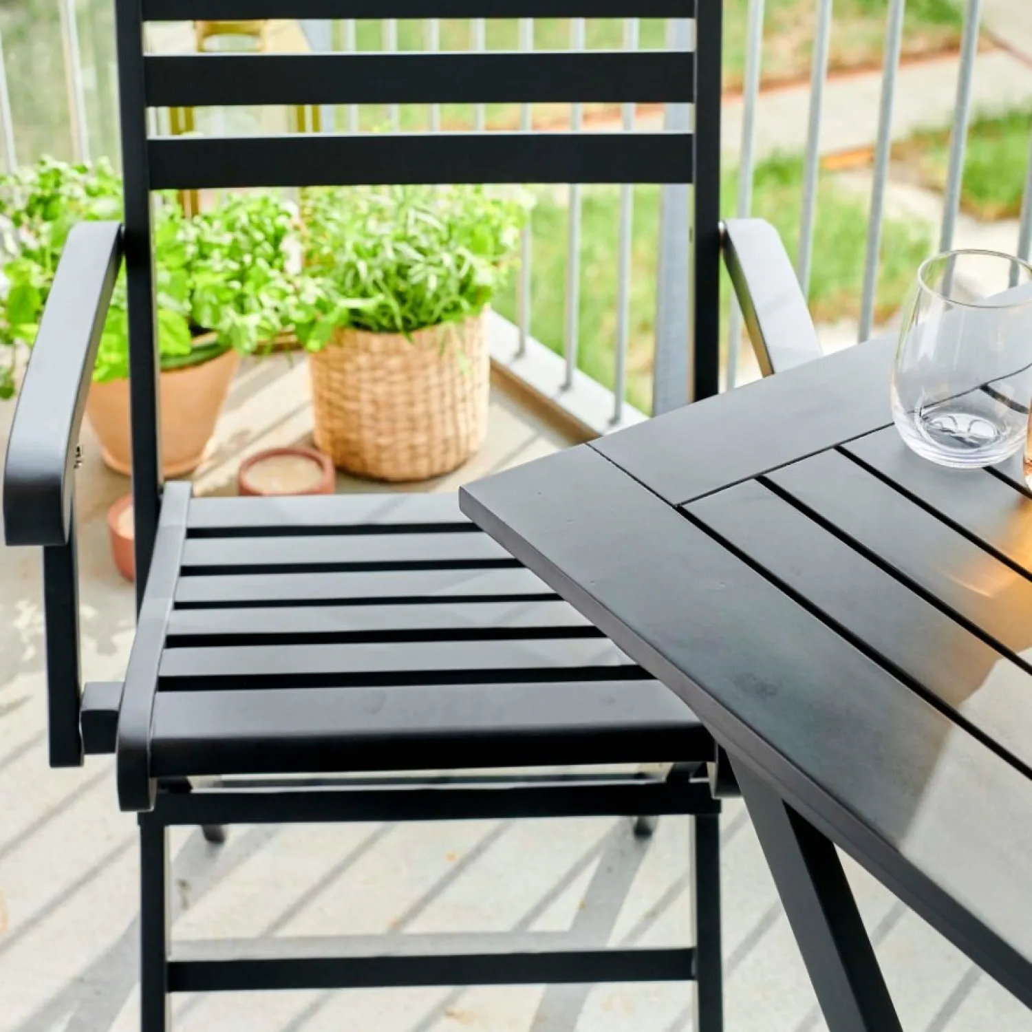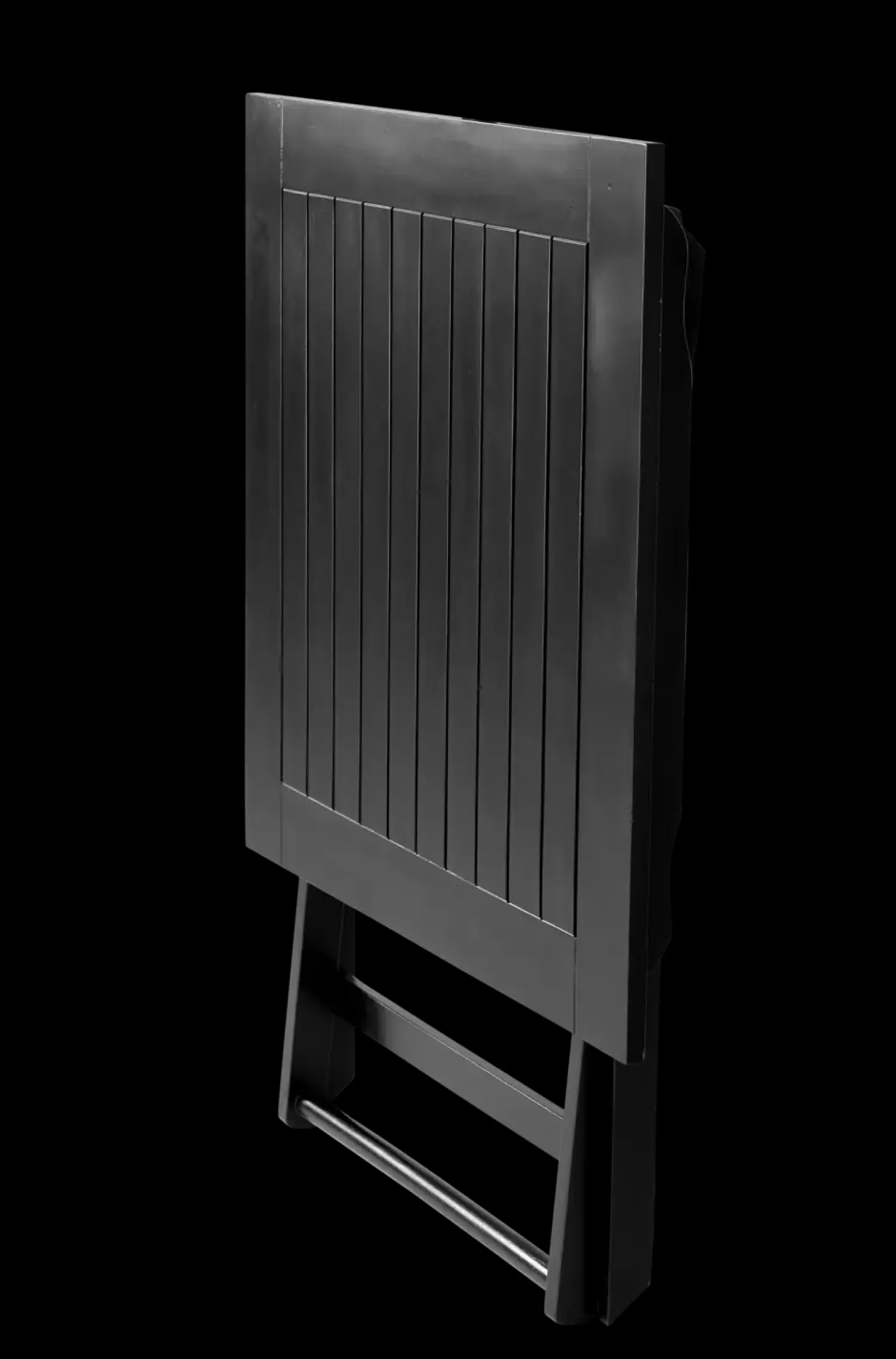 Cinas – Havebord – York foldebord 70x70cm mat sort er et kompakt bord designet til brug i haver eller på terrasser. Dette bord måler 70 x 70 cm med en højde på 72,5 cm og har et design, der kan passe ind i forskellige udendørs miljøer.