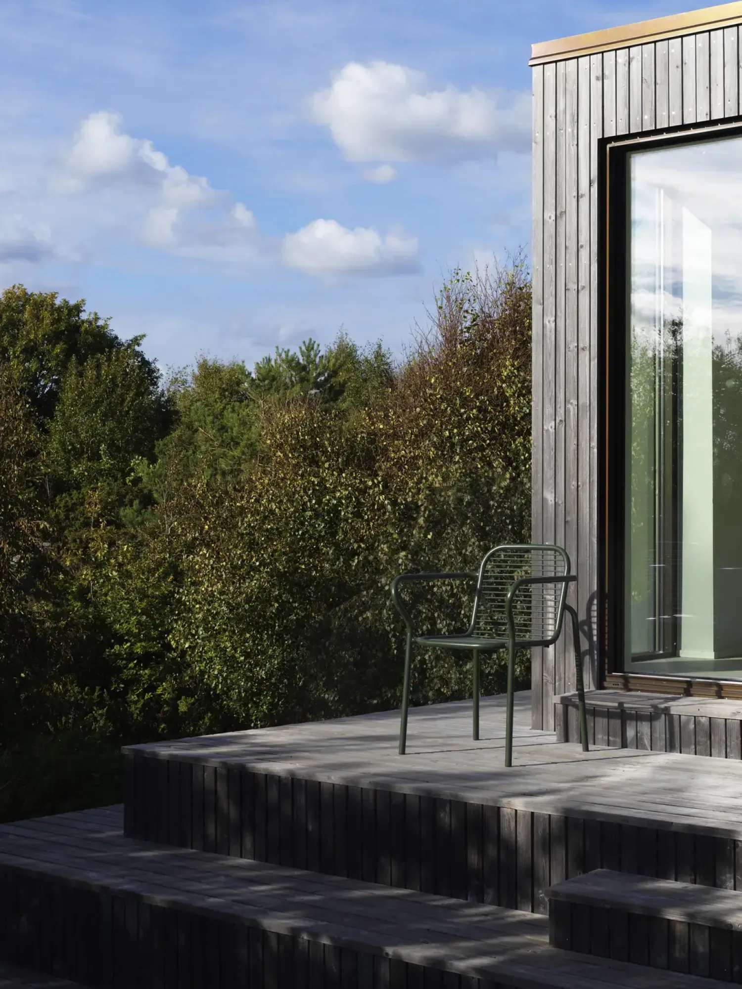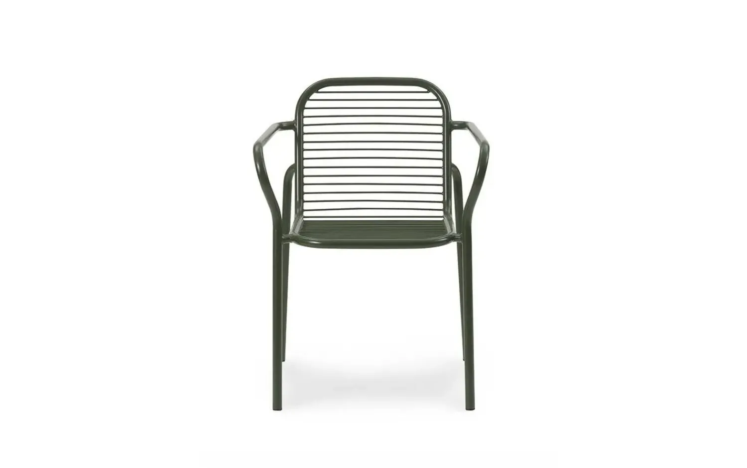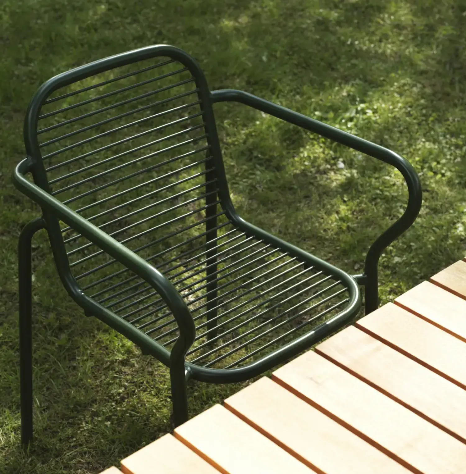Vig havestolen kombinerer dobbelt pulverlakeret stål og olieret Robinia-træ i et holdbart design. Den mørkegrønne farve giver stolen et roligt udtryk, mens de buede armlæn sikrer en behagelig siddekomfort i haven.