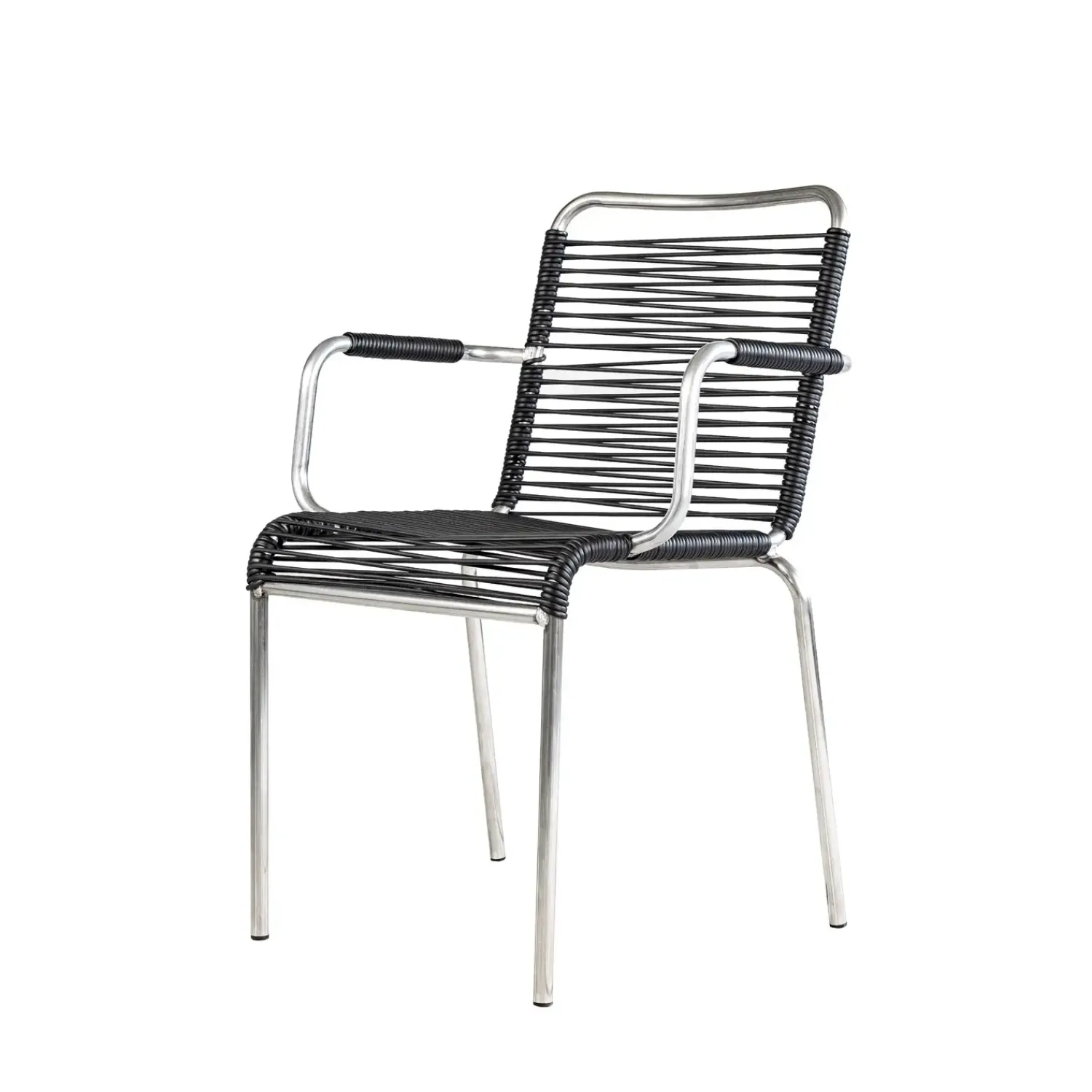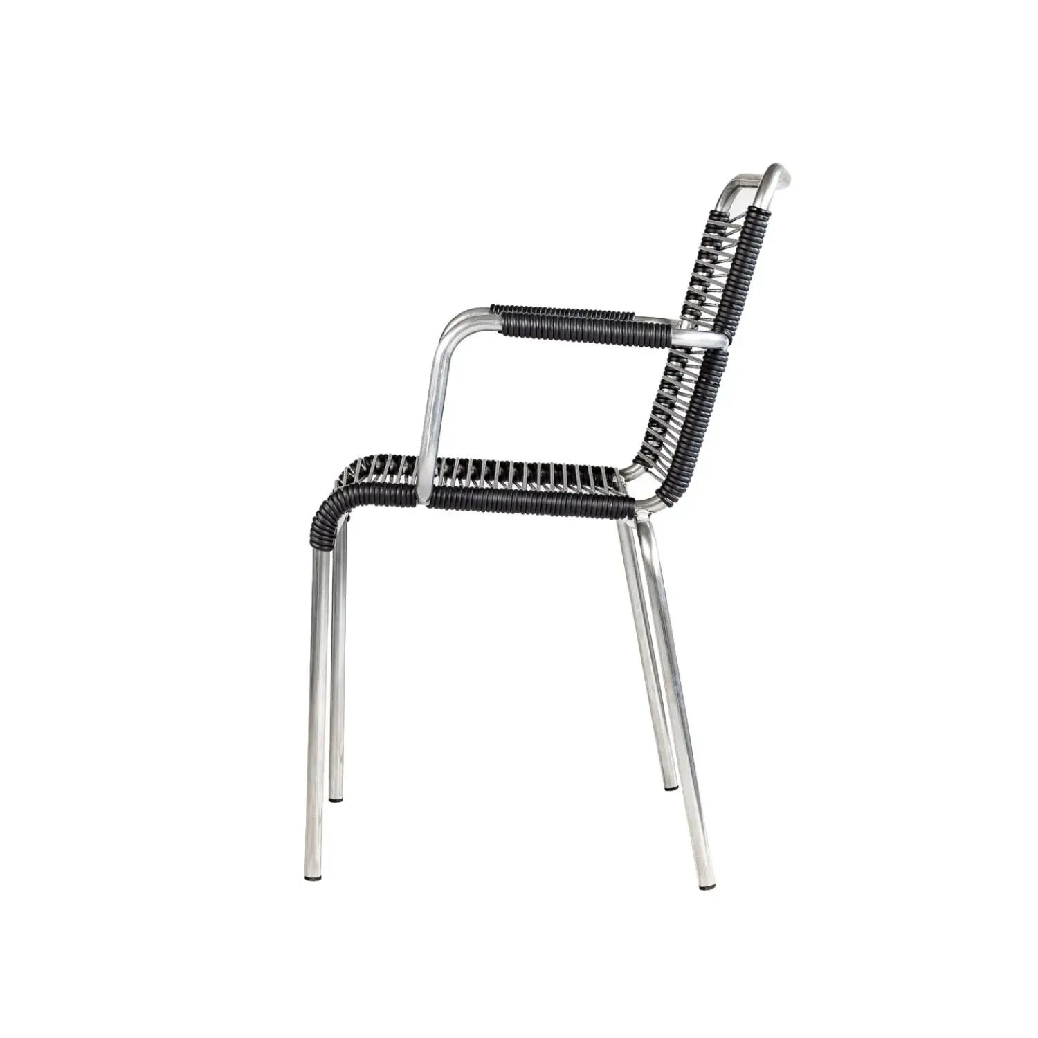 Stolen udmærker sig ved sin særlige konstruktion. Sæde, ryg og armlæn er omhyggeligt håndvævet i sort PVC spaghetti, hvilket giver et sofistikeret udseende og en behagelig siddekomfort. Den lette aluminiumsramme sikrer holdbarhed uden at gå på kompromis med mobiliteten. Denne kombination af materialer gør stolen velegnet til udendørs brug og nem at vedligeholde – ideel til forskellige udendørsmiljøer. Småridser i aluminiumet bliver mindre synlige over tid, hvilket giver stolen en charmerende patina.