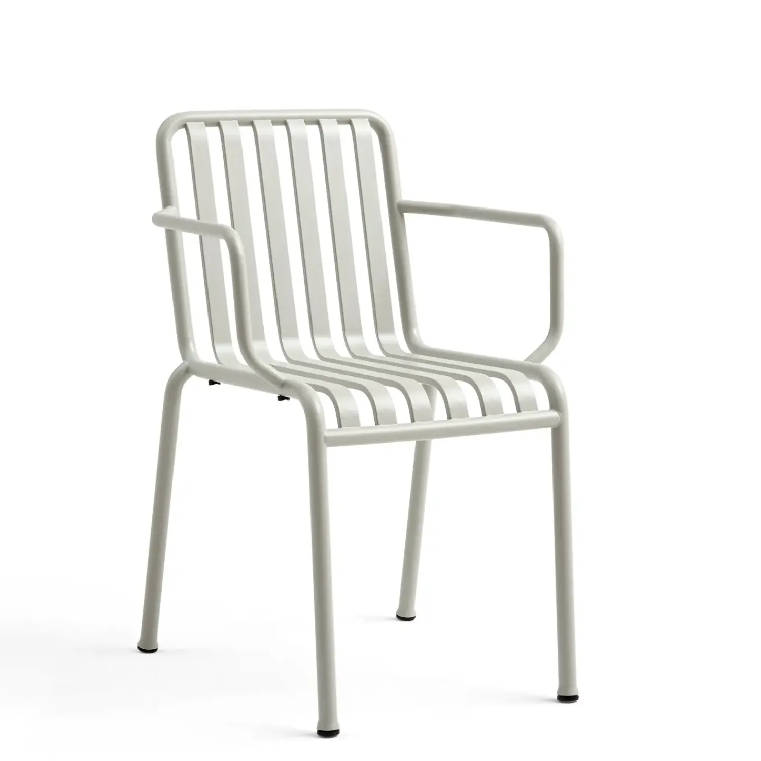 HAY havestol – Palissade armchair er fremstillet af elektrogalvaniseret, pulverlakeret stål, hvilket gør den egnet til udendørs brug. Denne robuste og vandafvisende konstruktion sikrer, at stolen kan modstå både sol, regn og vind uden at miste sin form eller finish. Den lysegrå farve giver stolen et sofistikeret udseende, der passer glimrende ind i enhver udendørs indretning.