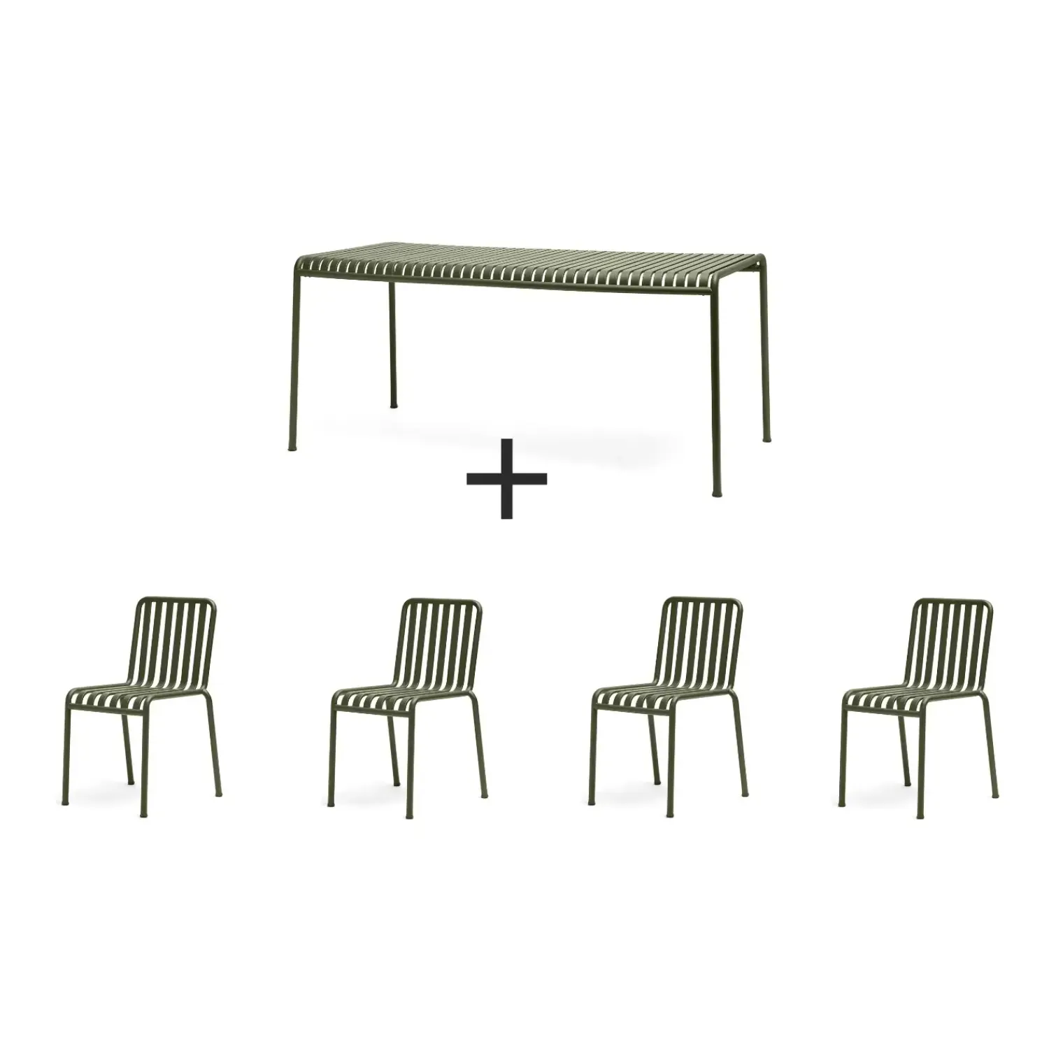 HAY Palissade-sættet tilbyder en kombination af stilfuld enkelhed og funktionalitet til din have eller terrasse. Dette sæt, bestående af et bord og fire stole, er designet til at være en pålidelig ledsager gennem mange udendørs måltider og hyggelige stunder. Den olivengrønne farve harmonerer smukt med de naturlige omgivelser og giver dit udendørsareal et raffineret præg.