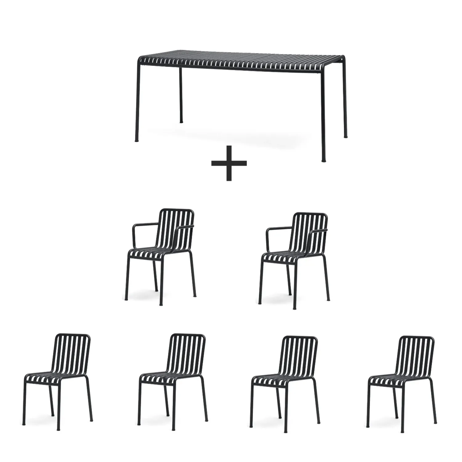 Dette sæt passer perfekt ind i enhver udendørs setting, fra private terrasser til caféer og restauranter. Den minimalistiske æstetik og den praktiske funktionalitet gør Palissade til et attraktivt valg for dem, der værdsætter kvalitet og tidløst design i deres udendørs møbler. Sættets sammensætning med fire almindelige stole og to armstole giver fleksibilitet og variation i siddepladserne, hvilket er ideelt til både hverdagsbrug og festlige lejligheder. Med HAY Palissade-sættet får du en komplet løsning til at skabe et indbydende og stilfuldt udendørs rum, der kan danne ramme om mange hyggelige stunder og samvær.