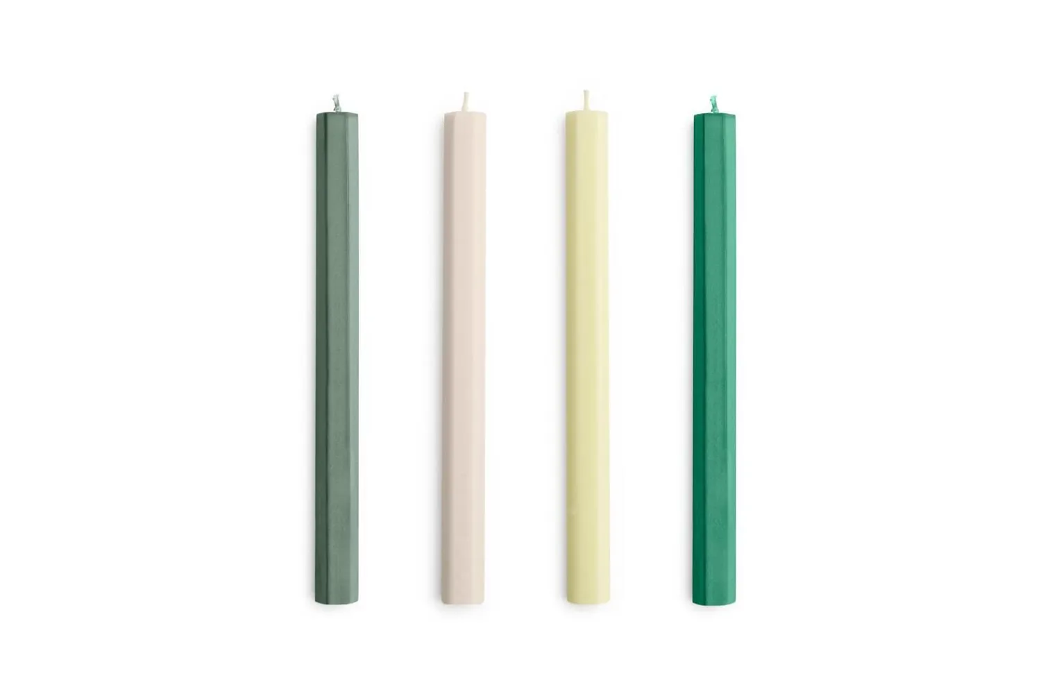 Fire stilfulde stearinlys i forskellige grønne og hvide nuancer giver dig frihed til at skabe din egen stemning. De sekskantede lys måler Ø2,2 x H24 cm og er fremstillet af 100 % stearin for en ren forbrænding.