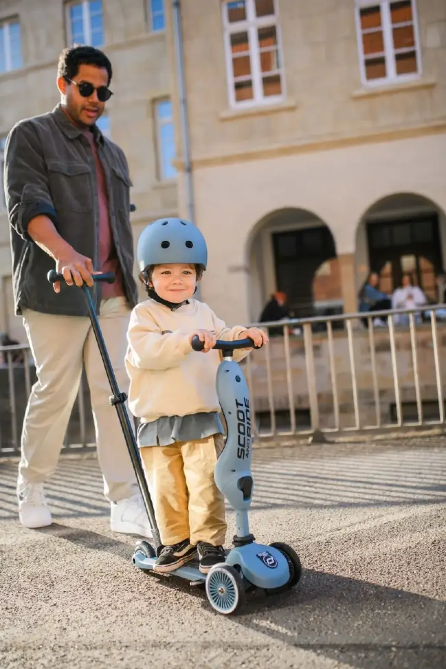Med denne funktion kan du nemt skubbe børn i alderen 1-3 år, både når de sidder og står. Stangen kan hurtigt fastgøres til scooterens fodbræt uden behov for værktøj og kan justeres i tre forskellige højder. Der er også mulighed for at tilføje fodstøtter, så børnene kan hvile deres fødder, mens de bliver skubbet. Alle de kendte funktioner fra Highway Kick 1, som det fleksible 2in1-system og det højdejusterbare sæde, er også inkluderet i Push and Go. Det betyder, at denne model vokser med dit barn. Der er en praktisk klods ved fronten, som forhindrer, at den tipper forover. Hjulene er i hård gummi.