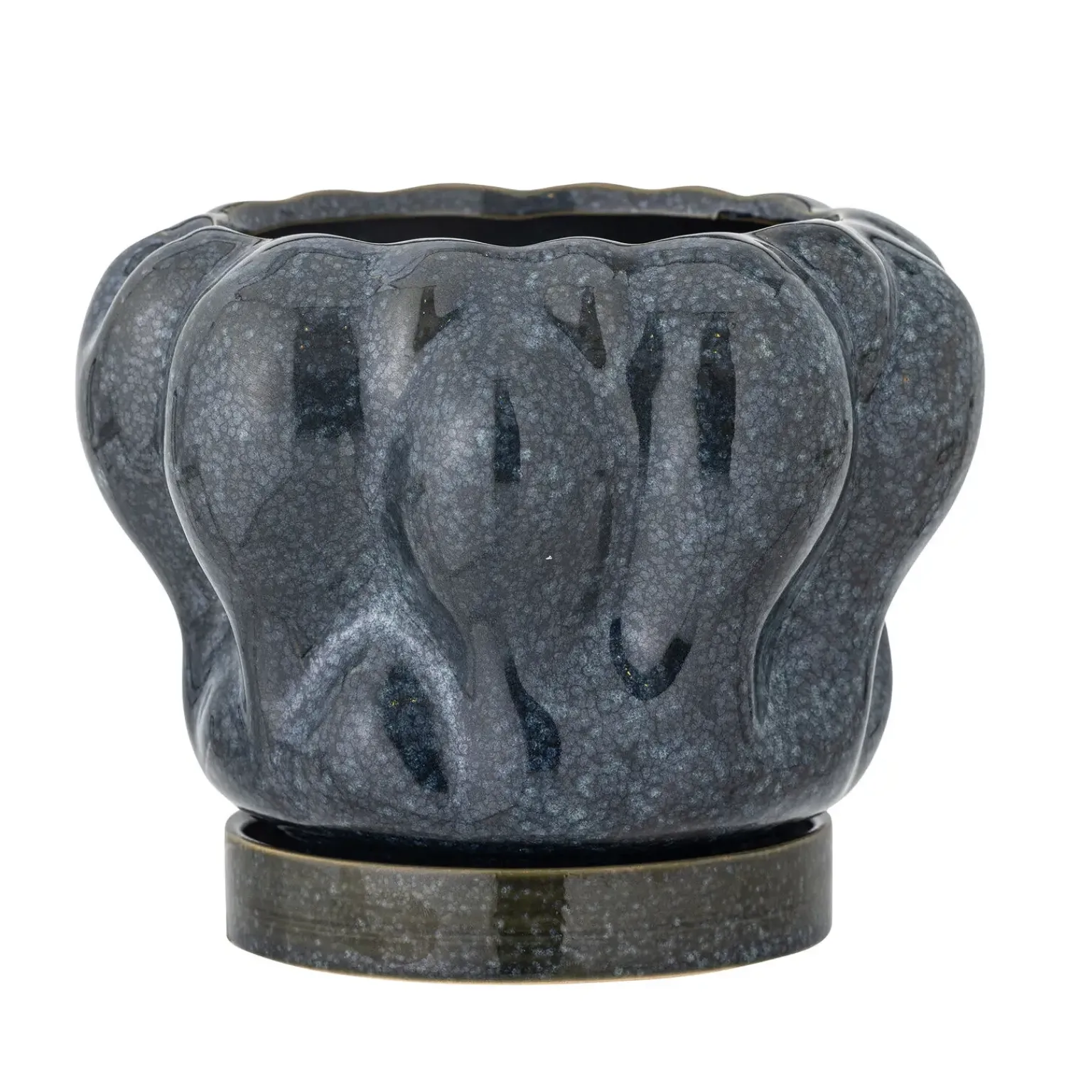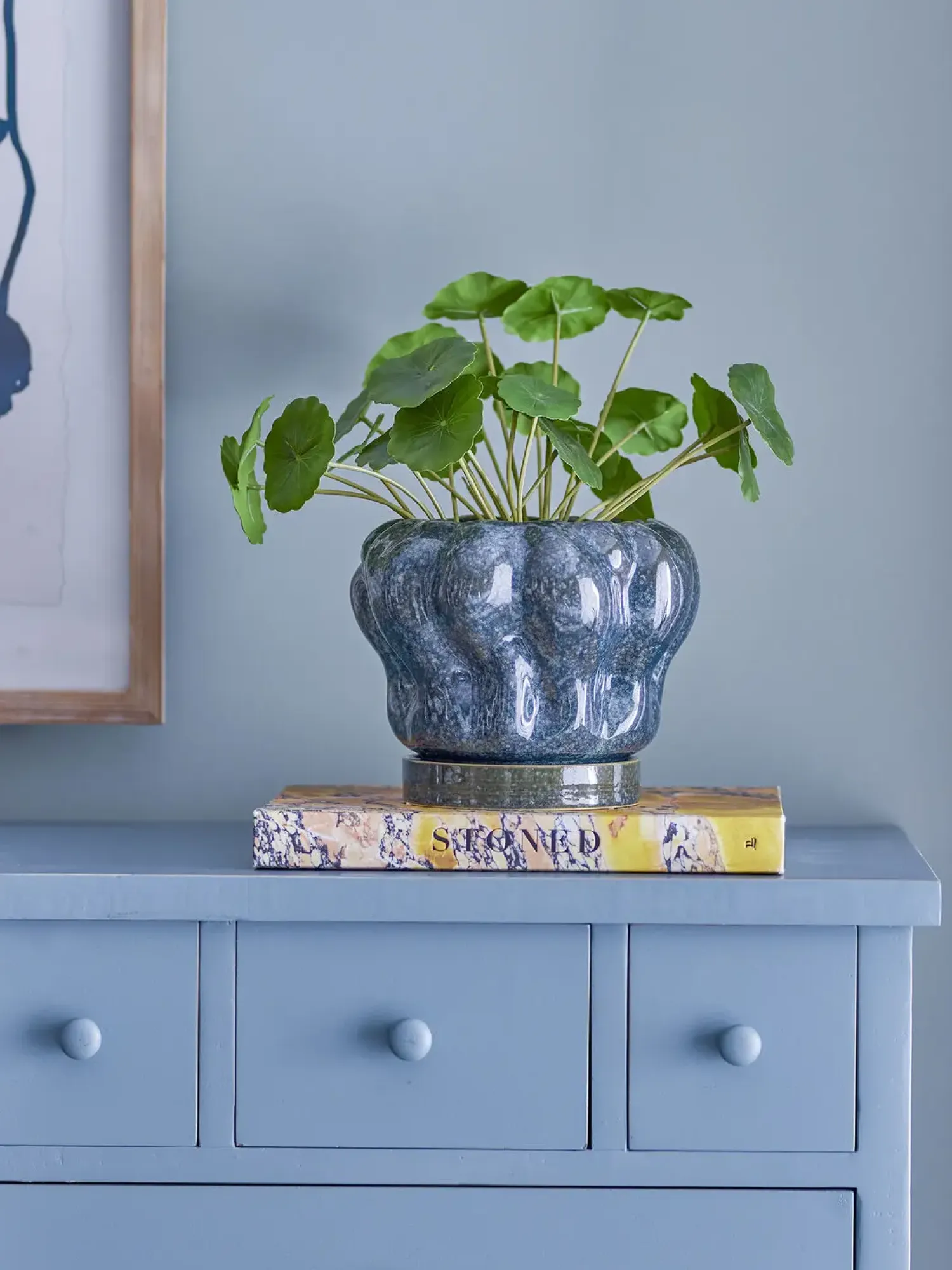 Den dybe blå glasur med skinnende finish skaber et roligt og harmonisk udtryk. Urtepottens marmorerede overflade giver den et naturligt og levende udseende, der passer ind i både moderne og klassiske hjem. Den bølgende form tilføjer en blød og organisk dimension.