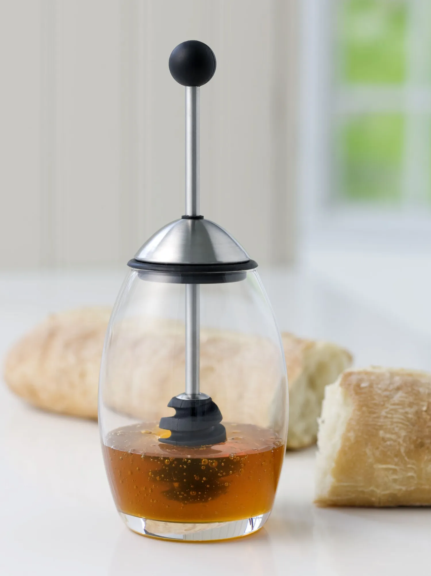 Det justerbare låg sikrer, at du altid kan nå honningen i krukken – også når der ikke er meget tilbage. Sprederen af sort silikone giver dig præcis kontrol over mængden, så du undgår spild og klatter på køkkenbordet.