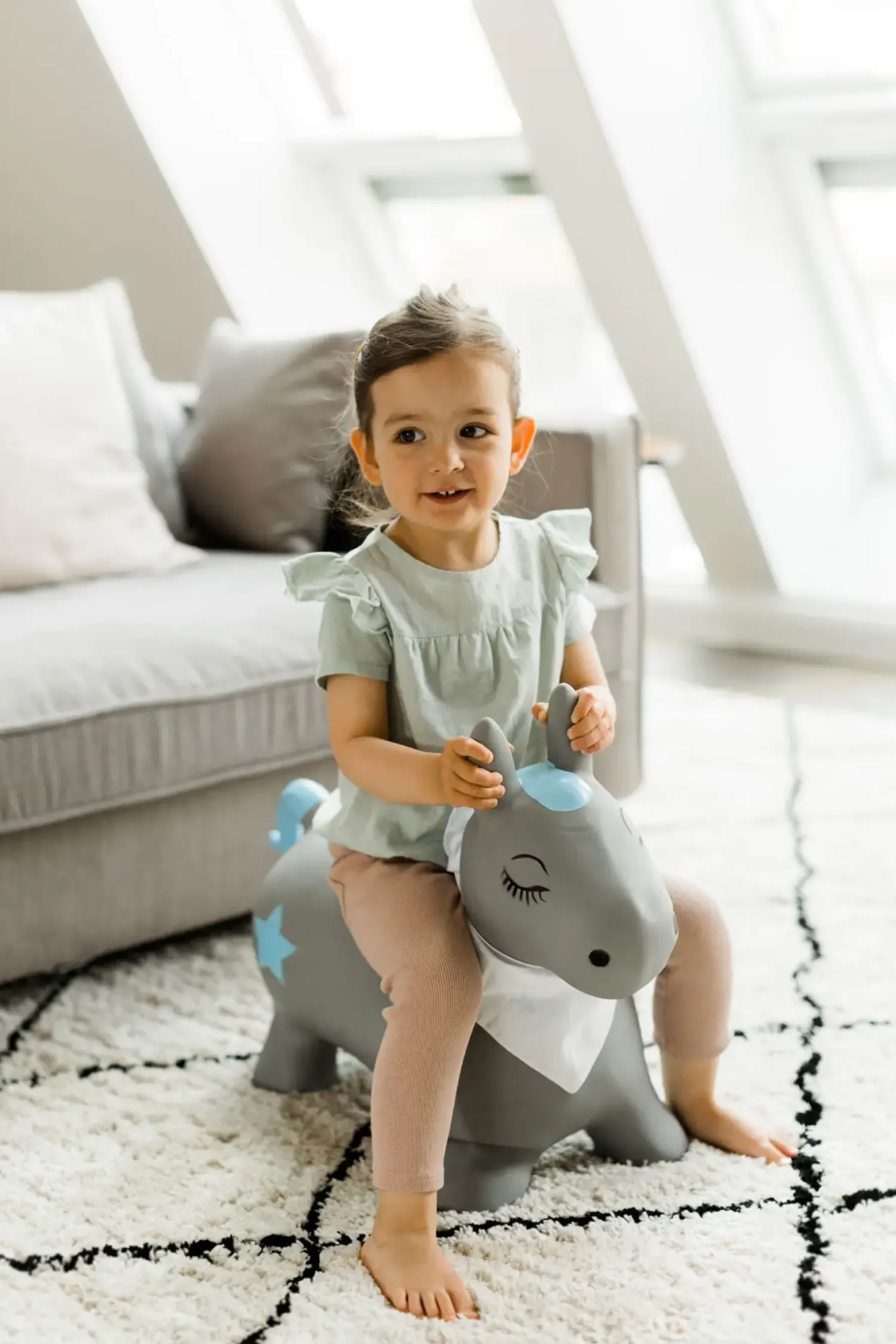 Det robuste materiale sikrer langvarig brug, uanset om du bruger hoppedyret i stuen eller haven. Med en vægtgrænse på 50 kg kan det følge dit barn gennem flere år. Alsidigheden betyder, at du får et legetøj, der fungerer i forskellige miljøer og situationer.