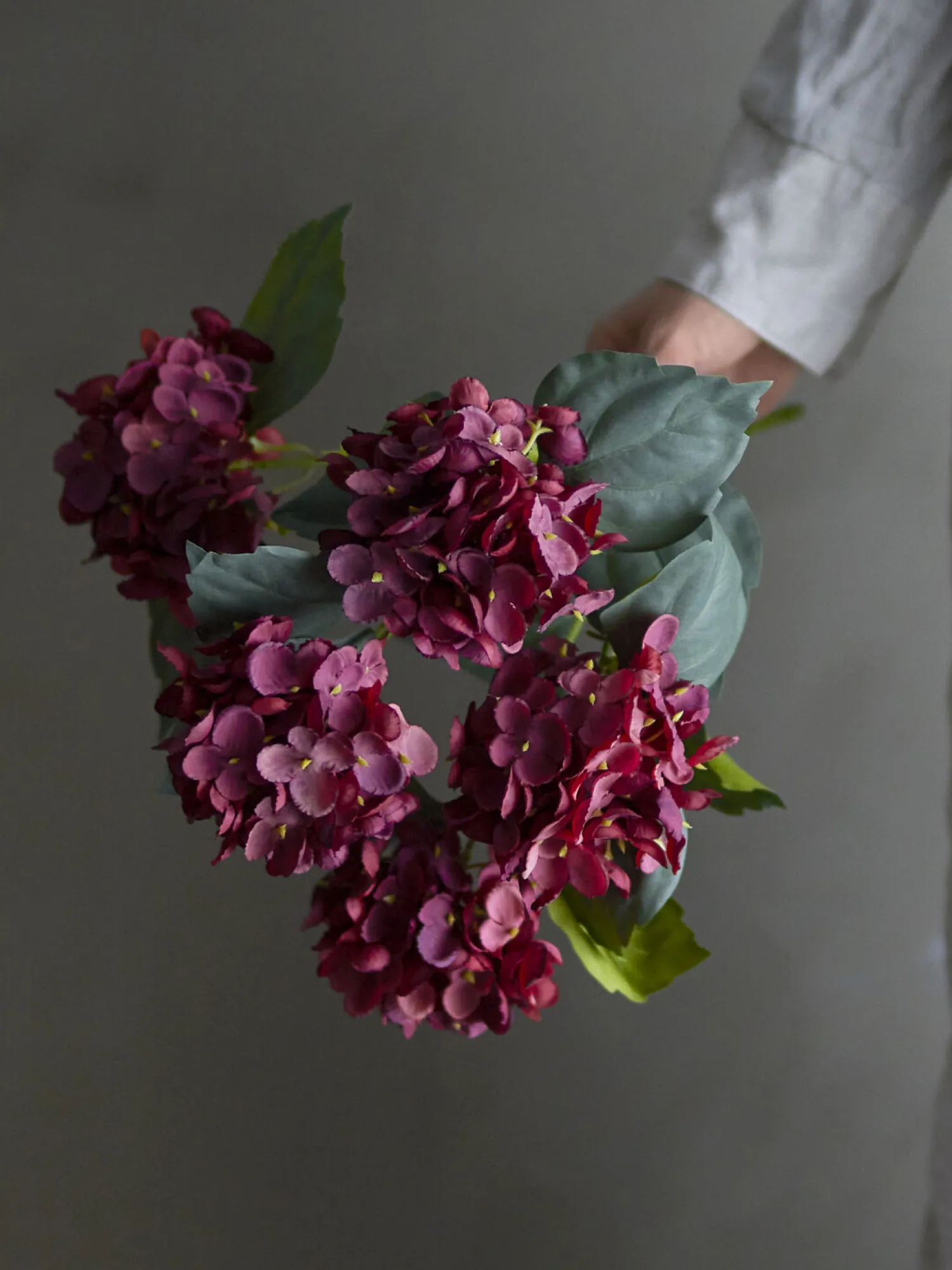 Denne kunstige hortensia fra Bloomingville bringer naturlig skønhed ind i dit hjem. Med sine dybrøde blomsterhoveder og grønne blade giver den et holdbart alternativ til friske blomster, som bevarer deres udseende år efter år.
