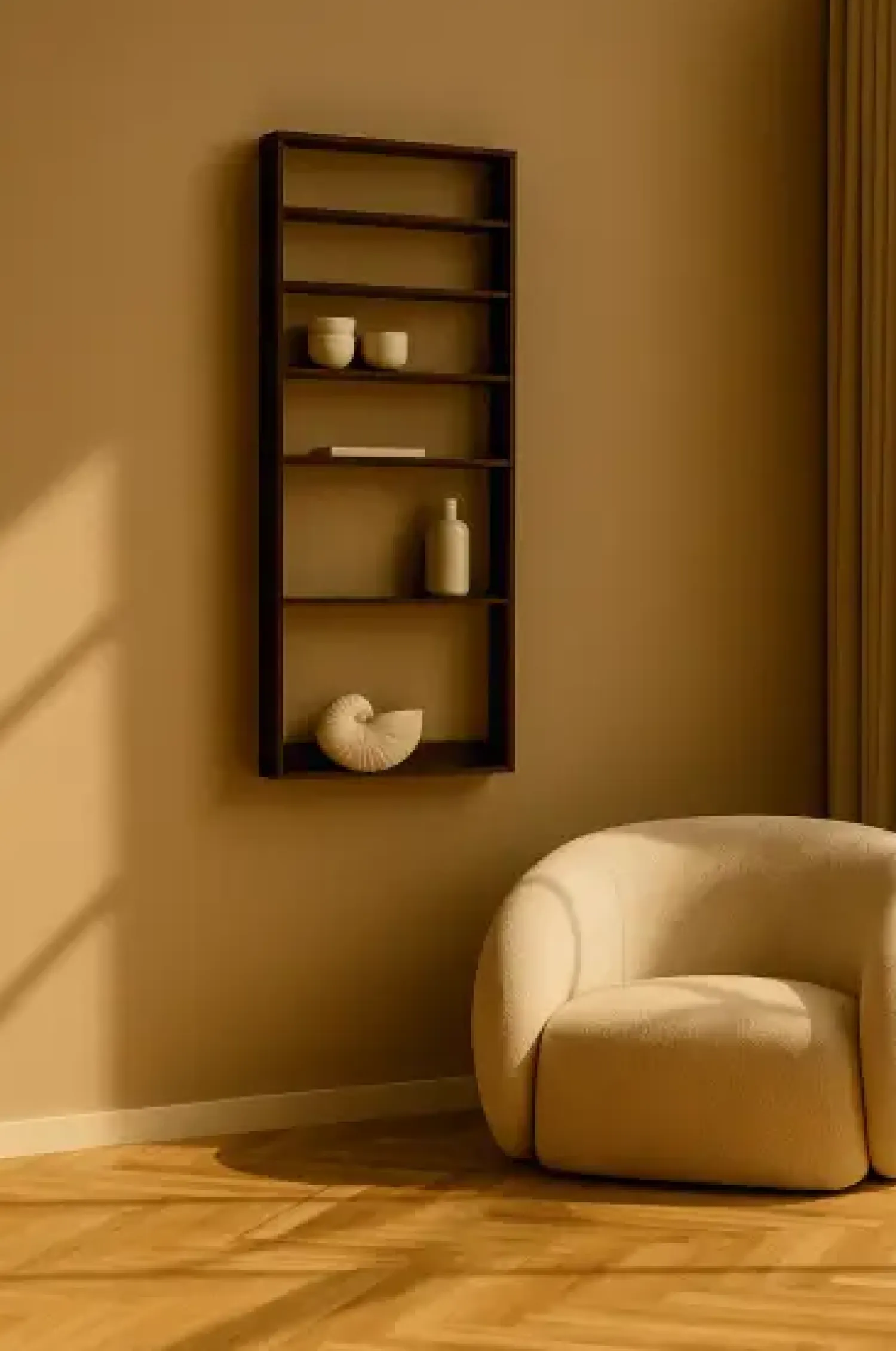 Denne vægreol er fremstillet af mørk eg, et materiale der giver både holdbarhed og en naturlig varme til dit hjem. Mørk eg er anerkendt for sin styrke og lange levetid, så du får en reol, der holder i mange år.