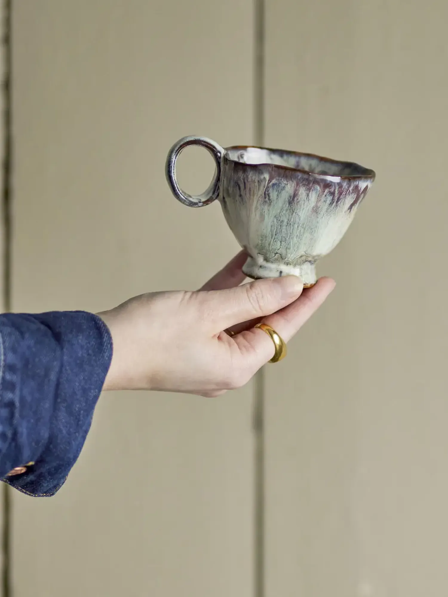 Håndlavet stentøjskop med reaktiv glasur, der giver hver kop et unikt udtryk i jordlige og blålige nuancer. Den bølgede kant og det runde håndtag gør koppen behagelig at holde om i hverdagen.