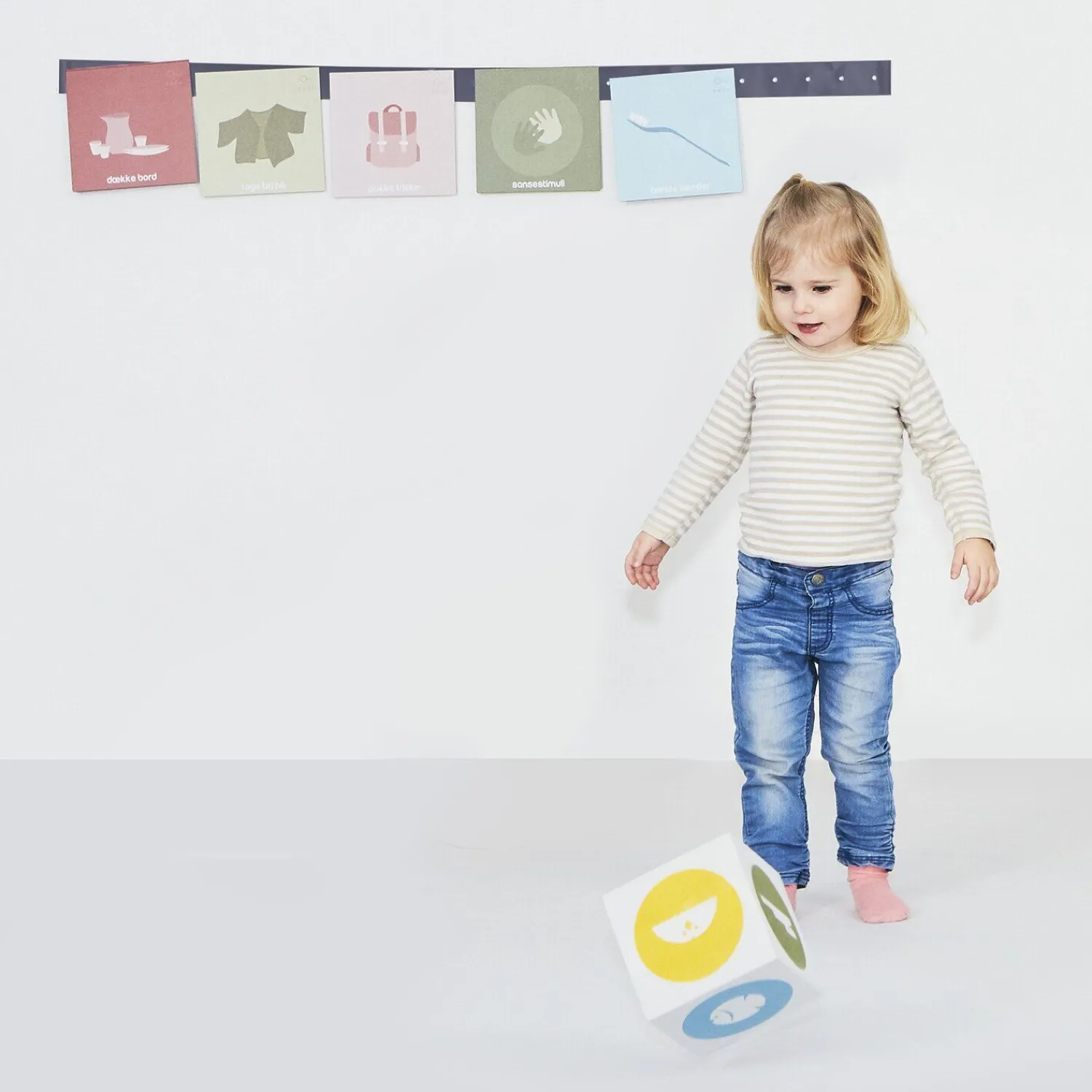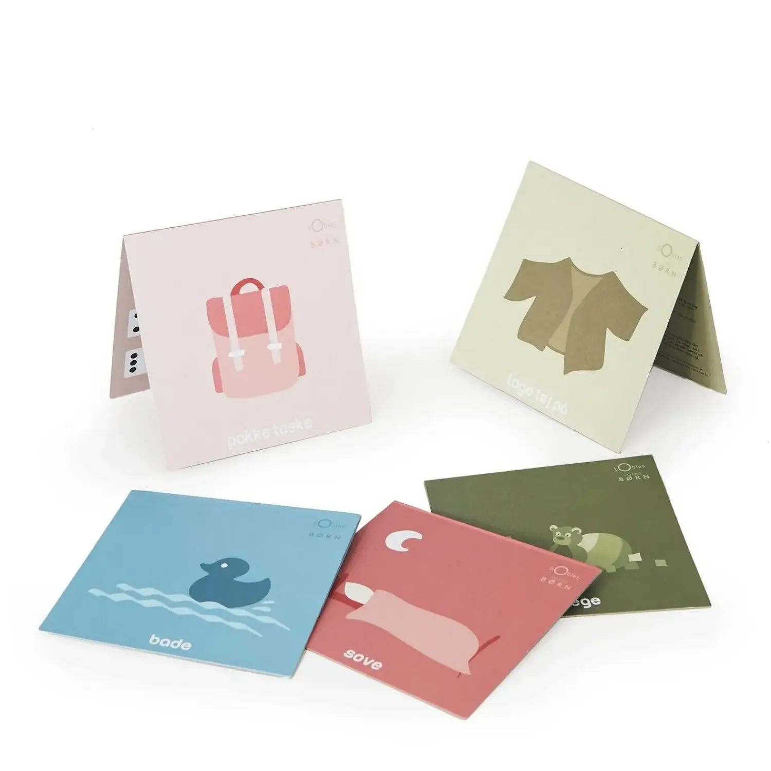 - Farverige kort med simple, tydelige illustrationer til leg