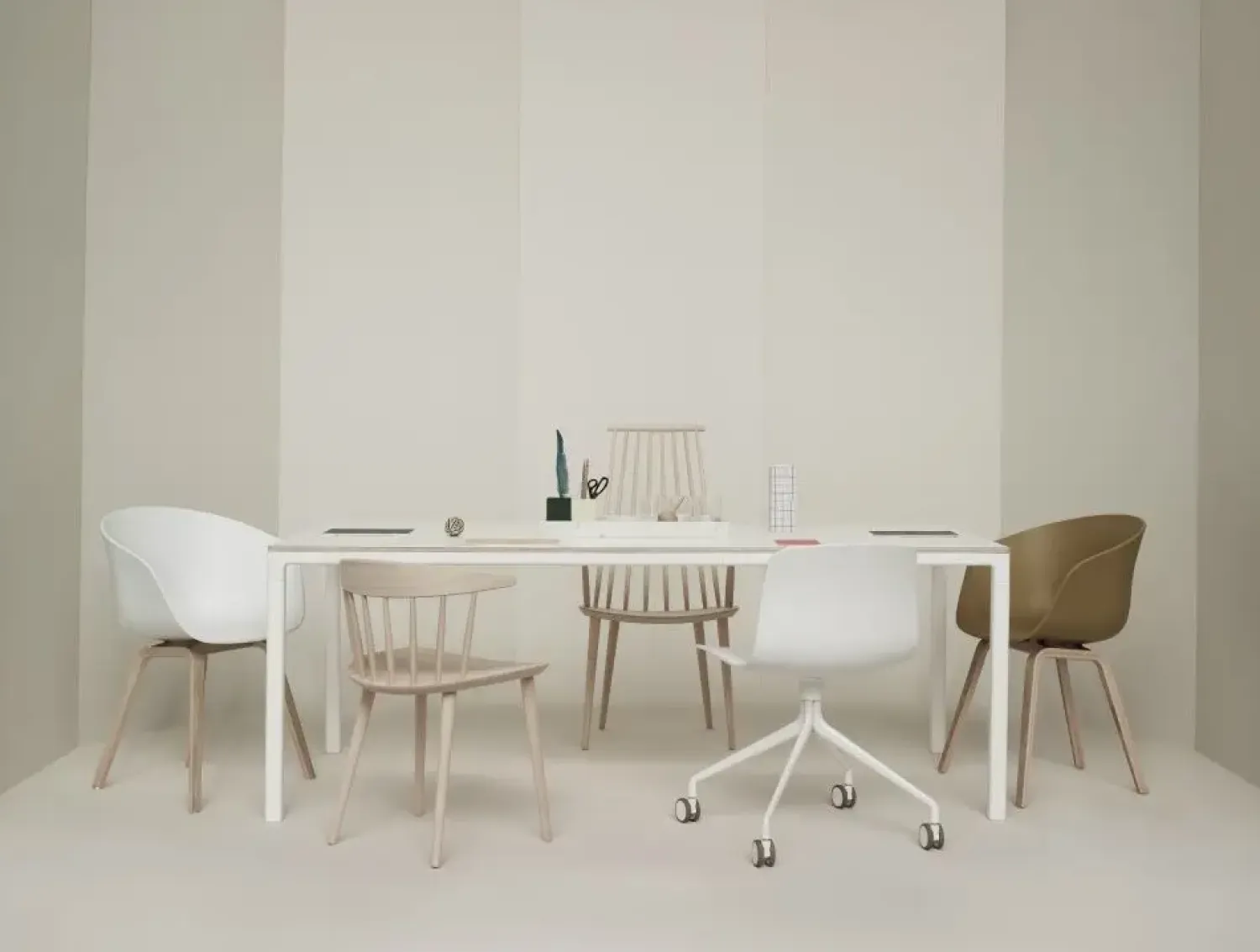 Denne spisebordsstol er skabt af den anerkendte designer Jørgen Bækmark for HAY. Det buede ryglæn med lodrette tremmer giver både god støtte og et karakteristisk udtryk, mens bøgetræet sikrer holdbarhed i hverdagen.