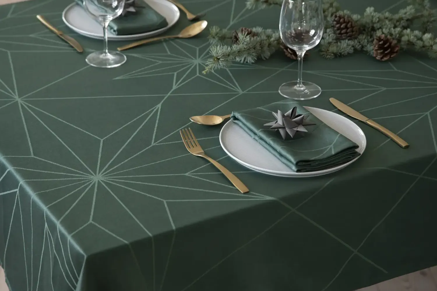 Giv dit julebord et strejf af sofistikeret charme med denne smukke juledug fra NovoForm. Den grønne dug, prydet med et fint geometrisk stjernemønster, skaber den perfekte ramme for hyggelige julefrokoster og festlige sammenkomster. De geometriske stjernemotiver, fordelt over dugen, tilføjer et subtilt og elegant præg, der komplementerer enhver juledekoration og fremhæver bordets festlige stemning.